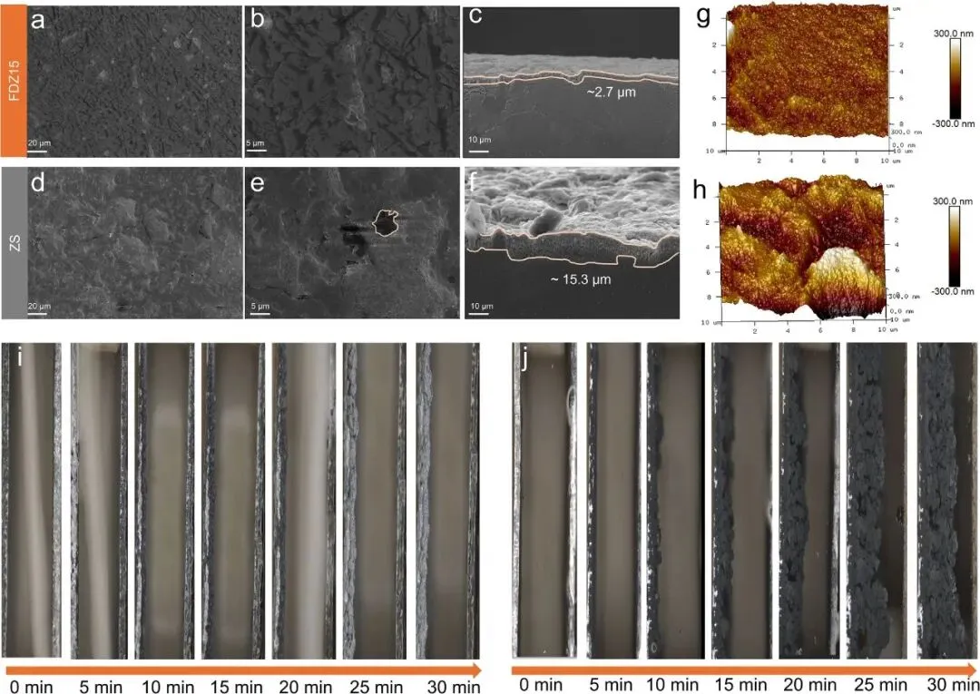 图2 | 不同电解质中在5 mA cm−2和0.5 mAh cm−2下循环50次后锌阳极表面的SEM图像。FDZ15组的(a,b)平面视图和(c)横截面;ZS组的(d,e)平面视图和(f)横截面;不同电解质中浸泡7天后电极表面的AFM测试,(g)FDZ15、(h)ZS;10 mA cm−2下锌沉积行为的原位光学显微镜图像,分别为(i)FDZ15和(j)ZS电解质