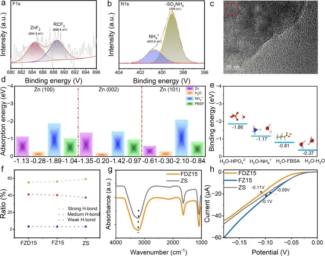 图3 | FDZ15组循环50次后电极表面的XPS谱:(a) F 1s和(b) N 1s;(c) FDZ15组浸泡7天后电极表面的TEM图像;(d) H2O/Zn2+/NH4+/PBSF在锌晶面上的吸附能;(e) NH4+/HPO42-/H2O/FBSA与H2O的结合能;(f) 不同电解质中强、中、弱氢键的卷积含量;(g) ZS组和FDZ15组的FTIR谱;(h) FDZ15、FZ15和ZS电解质在0.1 mV s−1下的LSV曲线