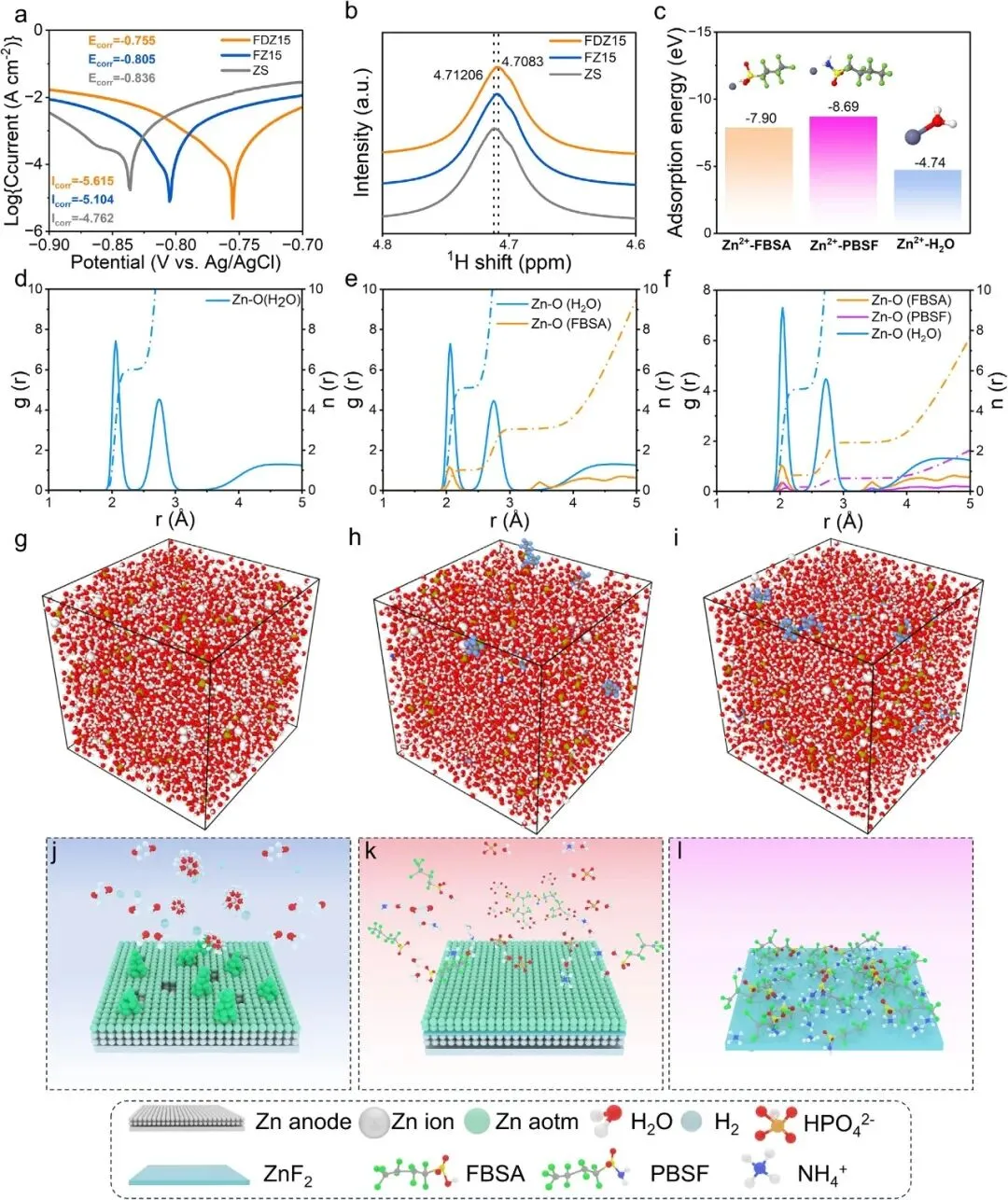 图4 | (a) 不同电解质中锌阳极的Tafel图;(b) 1H NMR谱;(c) H2O/FBSA/PBSF与Zn2+的结合能;(d-f) 不同体系中Zn2+–O(添加剂)、Zn2+–O(H2O)的径向分布函数及配位数:(d) ZS、(e) FZ15、(f) FDZ15;(g-i) 不同电解质体系MD模拟得到的快照:(g) ZS、(h) FZ15、(i) FDZ15;不同电解质AZIBs循环过程中电极/电解质界面特性演化:(j) ZS、(k) FDZ15;(l) FDZ15组SEI层的放大图