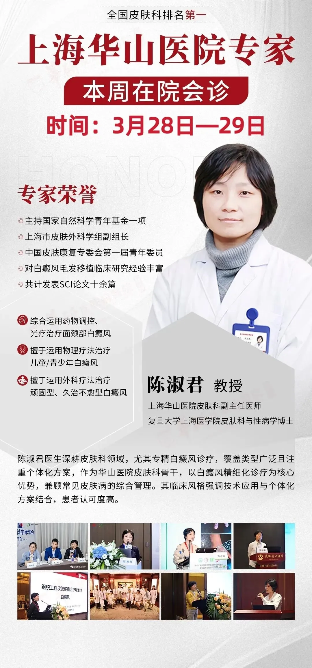 陈淑君教授,来自国内皮肤科领域顶尖学府——复旦大学附属华山医院,从事皮肤病临床、科研与教学工作数十年,拥有深厚的医学理论功底与丰富的临床实践经验。在常见及疑难皮肤病的诊断与治疗上造诣深厚,尤其擅长白癜风、银屑病、过敏性皮肤病、色素障碍性皮肤病等疾病的规范化、个体化治疗,凭借精湛的医术和严谨的态度,深受全国各地患者的信赖与好评。