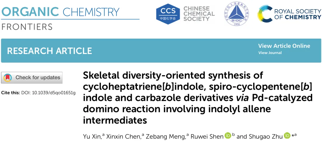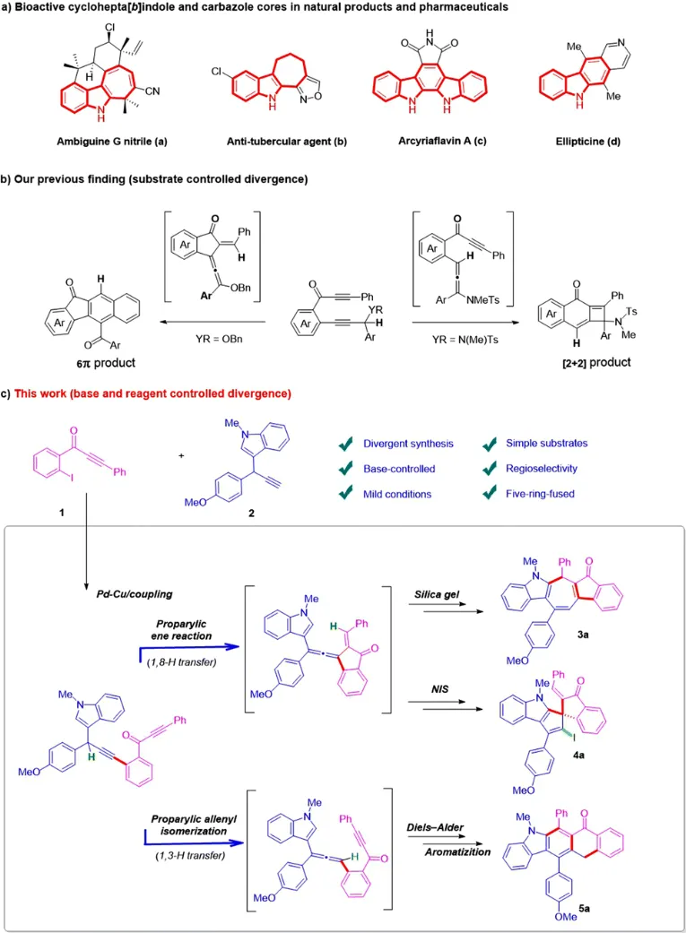 近日,南昌大学朱书高团队基于之前的工作 (ACS Catal., 2023, 13, 8402−8412;Org. Chem. Front., 2024, 11, 5884-5889;Org. Lett., 2024, 26, 10746-10751;Org. Lett., 2025, 27, 4, 967–972; Org. Lett., 2025, 27, 24, 6415–6421; Chem. Commun., 2025, 61, 10335-10338) 进一步报道了 Pd 催化、通过 “碱/试剂调控” 的串联反应体系,从相同的吲哚–炔酮底物出发,一锅体系中可分别生成三类骨架:环庚三烯[b]吲哚、螺环环戊烯[b]吲哚与咔唑,实现真正意义上的骨架多样性构筑。该工作基于高度反应性的吲哚基联烯中间体 (indolyl allene),通过碱调控 1,8-H/1,3-H 迁移与环加成、环化途径串联完成多环化合物调控合成。