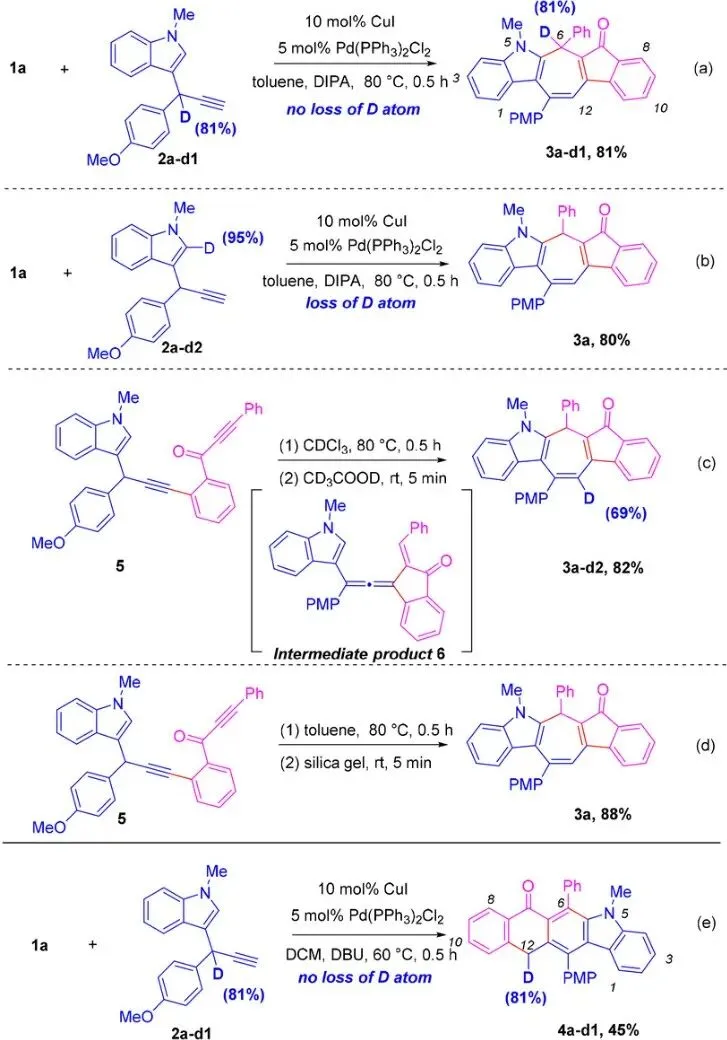 进行氘代实验验证 1,8-H/1,3-H 迁移路径,揭示了产物中关键位置的质子来源。