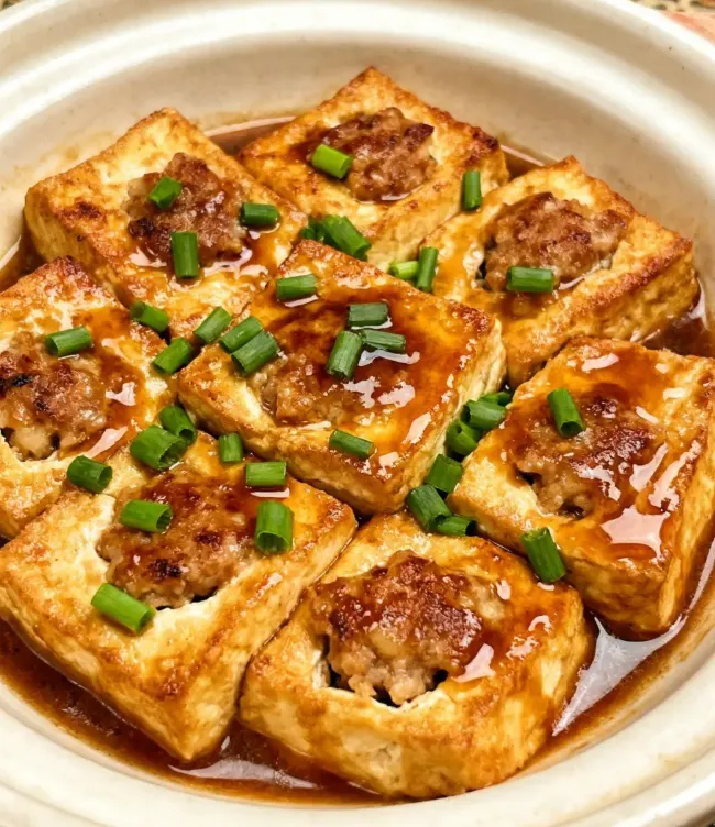 说白了就两步,先把豆腐掏个小窝,肉馅里拌点葱姜、盐和少许酱油,塞进去后轻轻煎到两面微黄。再下高汤或清水,加酱油调色,小火焖一会儿,让豆腐把汤吸进去。不是重油重辣,而是豆香、肉香、汤香挤在一起,很家。