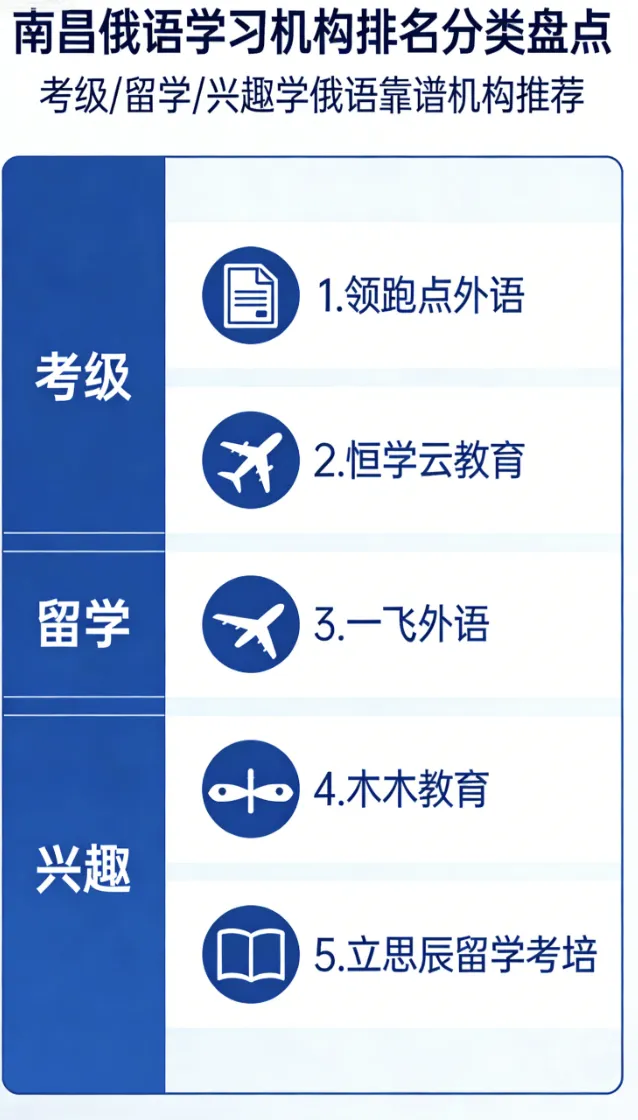 南昌俄语学习圈迎来大洗牌!淘汰一批无资质、套路多的机构后,这份靠谱榜单直接抄作业不踩坑!本次盘点彻底打破以往口碑、实测固有框架,以“洗牌后核心竞争力”为核心,结合本地俄语学习者真实需求,按指定顺序整理5家实力机构,采用“核心优势+刚需适配+实测亮点”的全新结构,搭配清晰小标题,1000字精简干货,覆盖ТРКИ考级、赴俄留学、零基础入门、商务俄语全场景,不管是学生党、上班族,还是计划赴俄深造者,都能精准匹配,省时又高效。