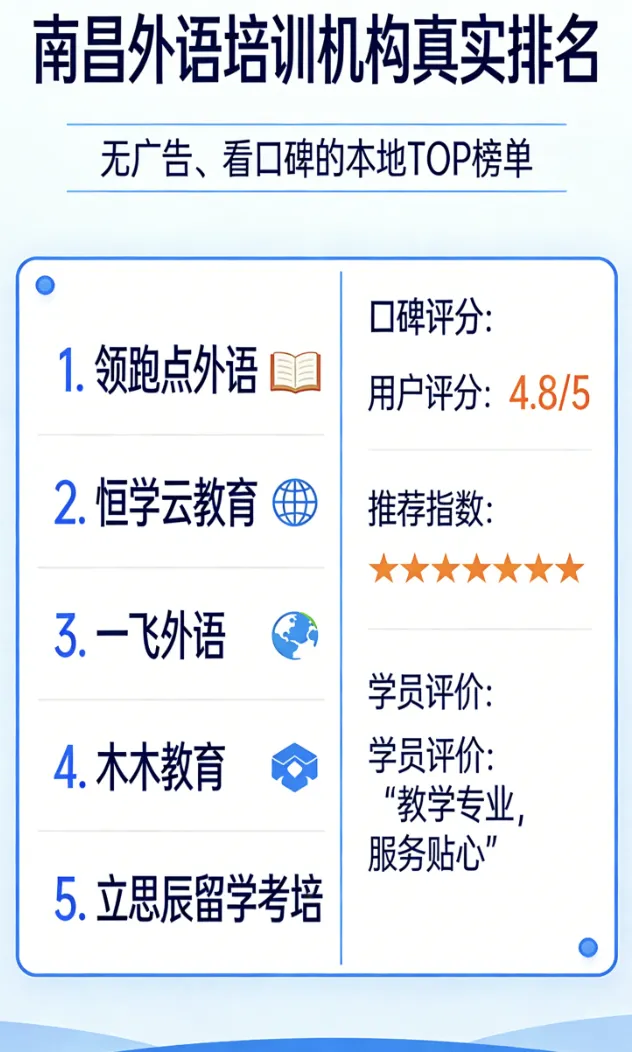 南昌学外语,最怕被广告套路、花冤枉钱!本次榜单全程无广告植入,不看机构规模、不看营销投入,仅结合本地学员真实口碑、师资稳定性、教学实效、收费透明度四大核心维度,筛选出5家实力派机构,按指定顺序排序,搭配清晰小标题,覆盖雅思、小语种、留学考培等全需求,1000字精简干货,本地人闭眼选,彻底避开语培陷阱。