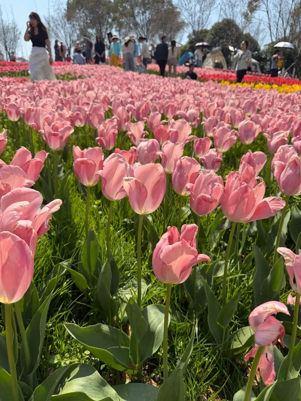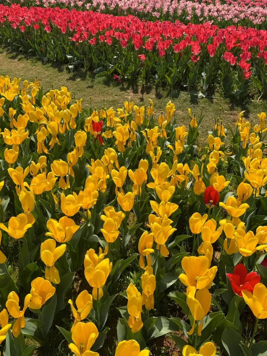 整个园区就是——粉的、红的、黄的、紫的……一整片铺开,真的像打翻的调色盘