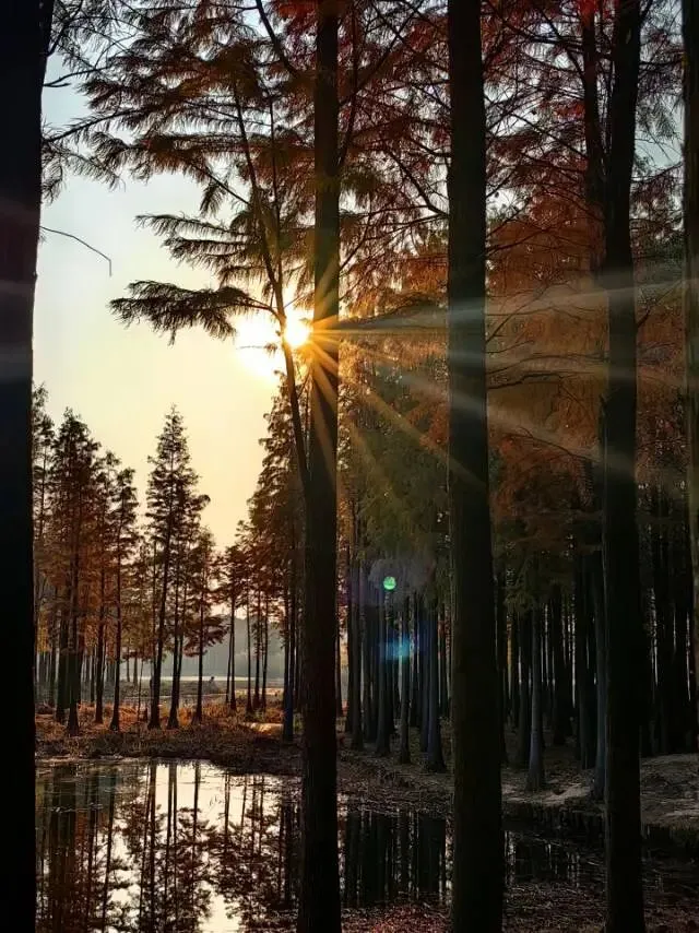 傍晚的夕阳洒在湖面和水杉上,暖乎乎的氛围感拉满