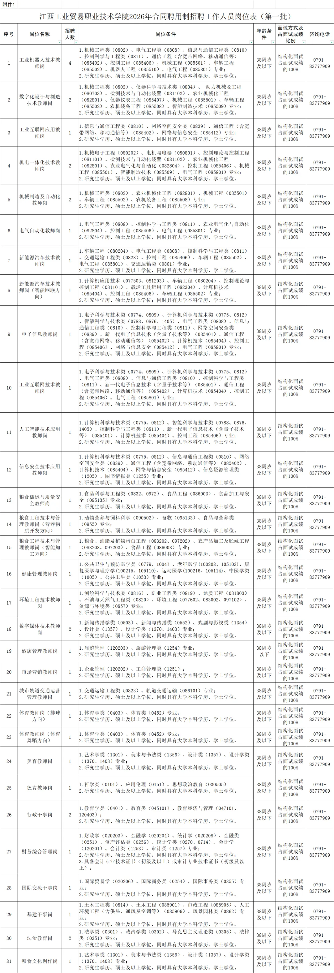 招聘岗位条件详见《江西工业贸易职业技术学院2026年合同聘用制招聘工作人员岗位表(第一批)》(见附件1)。