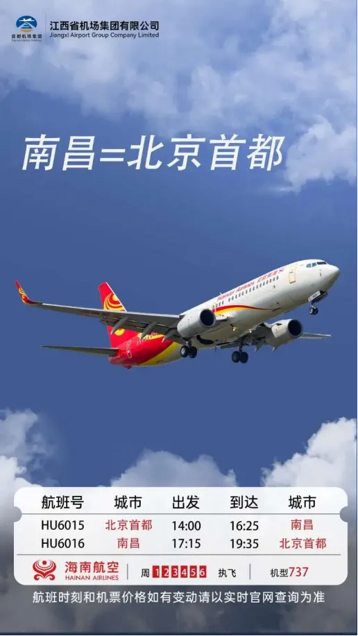 4月2日起,海南航空新增南昌=北京首都往返航班航班号为HU6015/16,由波音B737执飞。加密后南昌至北京往返航班最多每天16班。