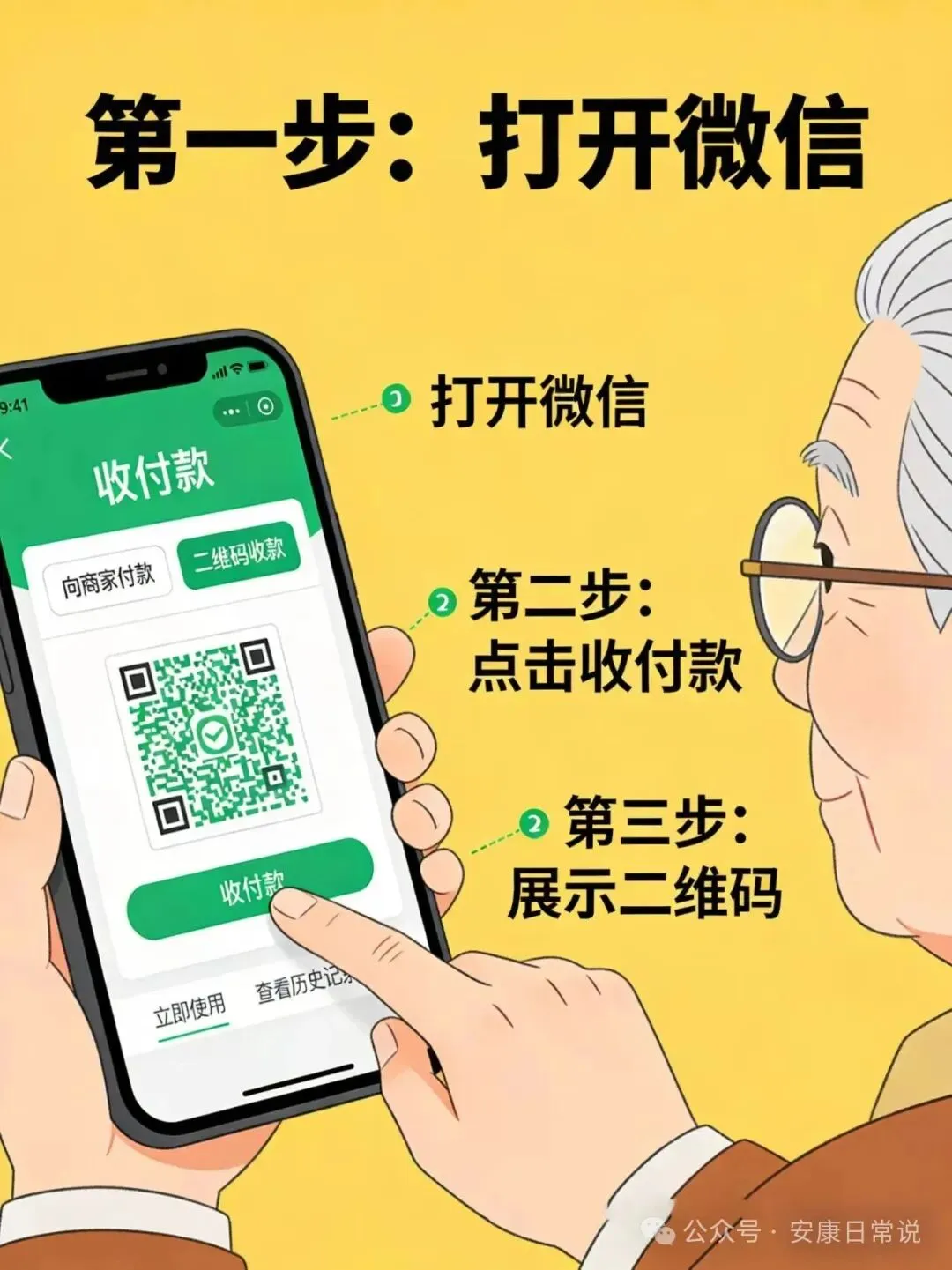 小提醒:声音小按侧面音量+键,看不清可以把手机拿远一点。二、出门买东西,手机怎么付钱?