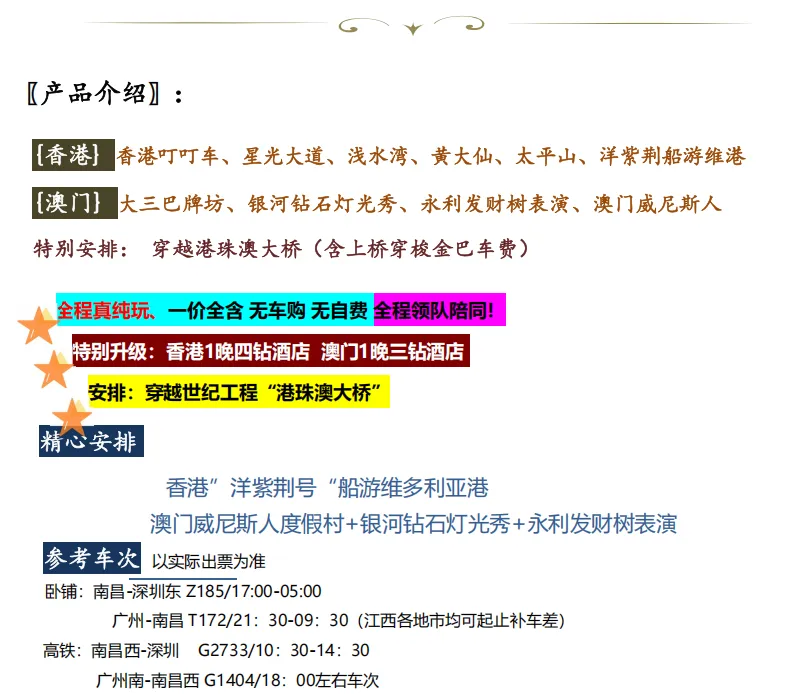 酒店:香港 1 晚四钻酒店+澳门1 晚品牌三钻酒店用餐:全程5正餐3早餐,澳门酒店含早,香港为打包,简餐如不吃则视为自愿放弃用餐不退费。含洋紫荆船餐、澳门酒店港式分餐门票:景区首道门票(不含景区内设自费项目及行程内注明自费项目)用车:当地空调53座旅游车,保证每人一正座(正规26座以下的车型均无行李箱)