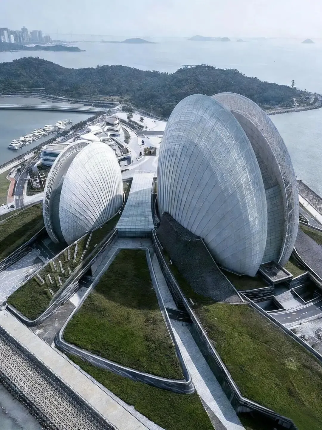 【日月贝大剧院】(约30分钟)珠海大剧院位于珠海情侣路野狸岛海滨,是中国唯一建设在海岛上的歌剧院,总建筑面积59000平方米,包括1550座的大剧院、550座多功能小剧院等,大小剧场呈日月双贝造型,又称“大贝壳”、“小贝壳”,其中“大贝壳”最大高度90米。