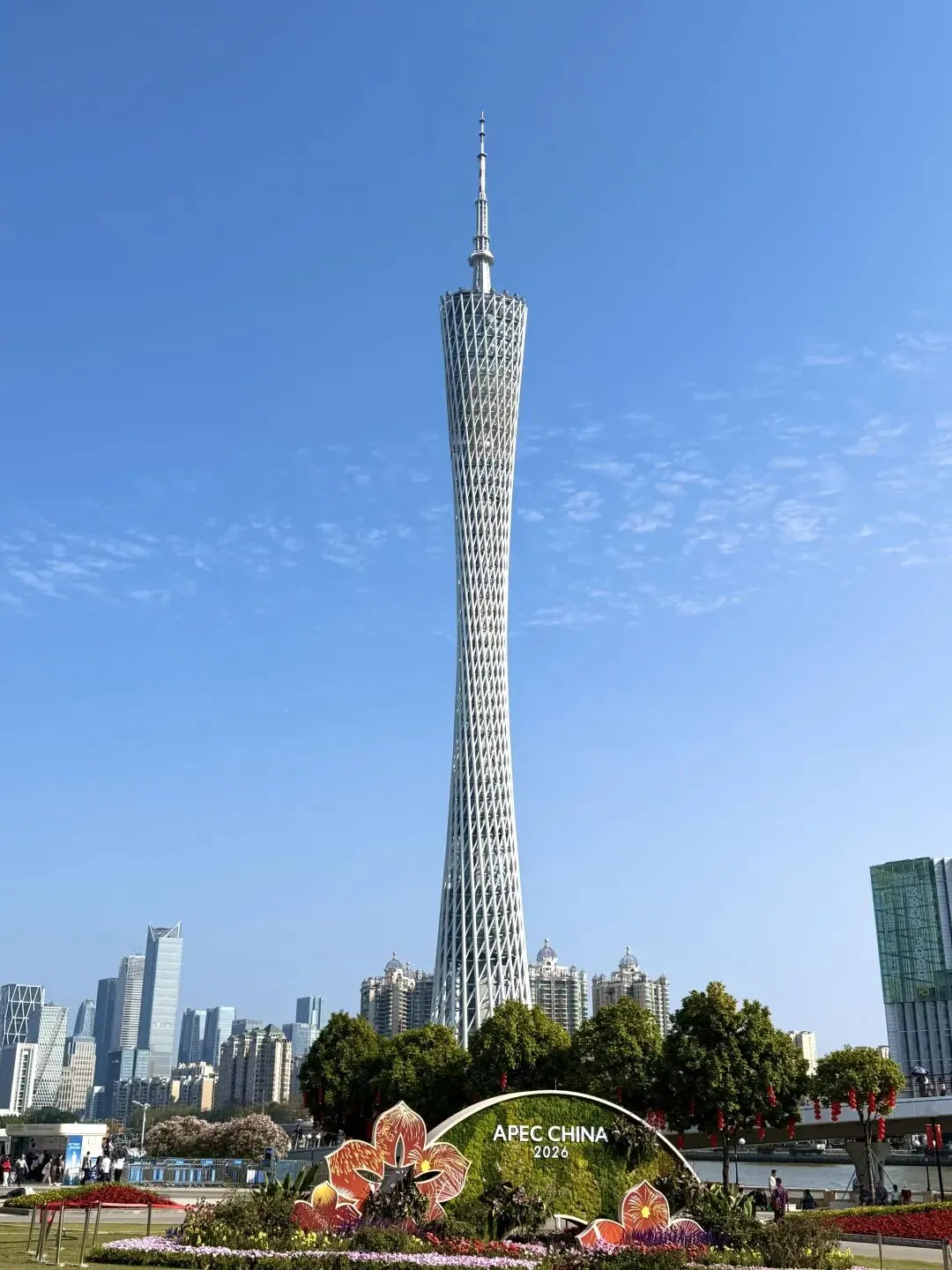 广州塔/城市花园外观,又称广州新电视塔,昵称小蛮腰或水蛇腰(粤),位于中国广州市海珠区(艺洲岛)赤岗塔附近,距离珠江南岸125米,与海心沙岛和广州市21世纪CBD区珠江新城隔江相望。广州塔塔身主体450米(塔顶观光平台最高处454米),天线桅杆150米,总高度600米,后前往广州高铁或白云站返回。