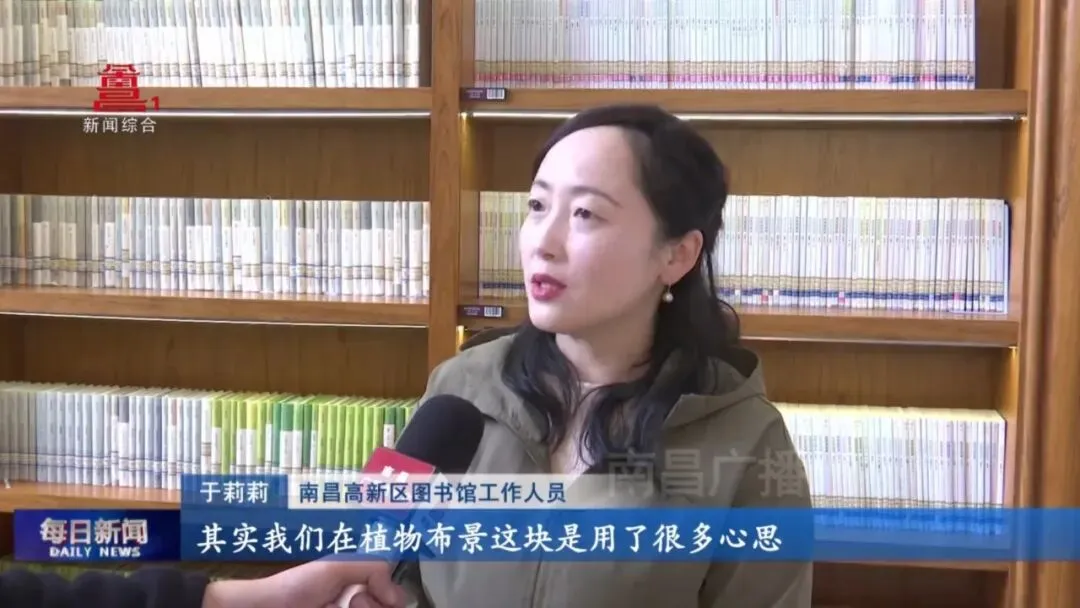南昌高新区图书馆工作人员 于莉莉:“在我们图书馆里面,植物布景这块用了很多心思,基本上会结合一年四时的节气,采用当下的植物来进行装点,从而营造‘会呼吸的文化森林’的阅读氛围。”