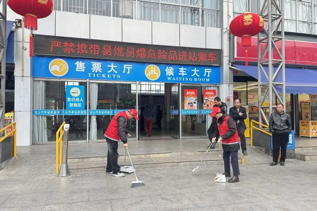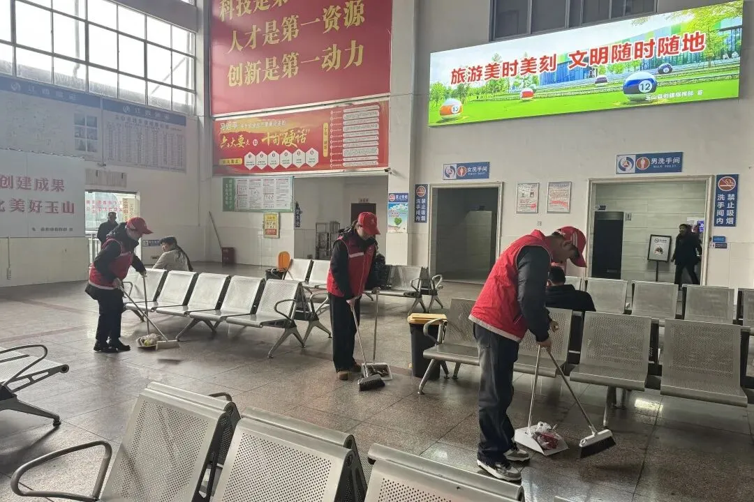 玉山收费站“熊文清班组”将志愿服务台前移,走进玉山汽车站、客车站,开展“学雷锋、优服务、树形象”主题活动。志愿者们手持清洁工具,对客运站广场、候车区域、公共设施等进行全面清扫,不放过一个卫生死角。他们用双手美化出行环境,为过往旅客营造干净、舒适的出行体验,以实际行动助力文明城市建设。同时,志愿者们还现场提供ETC办理、高速路况、安全行车提示等咨询服务,获得现场群众的一致好评。