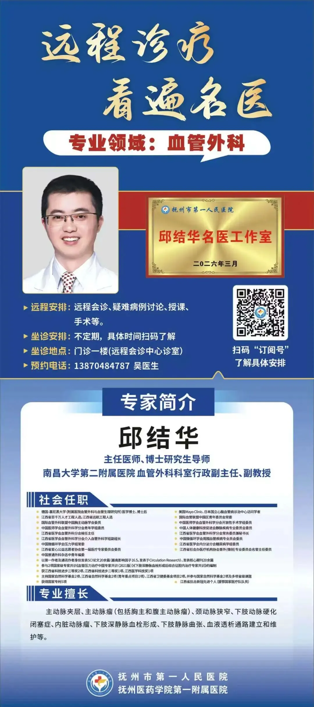 为满足群众就医需求,提升本地血管外科学科诊疗水平,抚州市第一人民医院特邀南昌大学第二附属医院血管外科行政副主任邱结华教授来院坐诊及手术。具体安排如下: