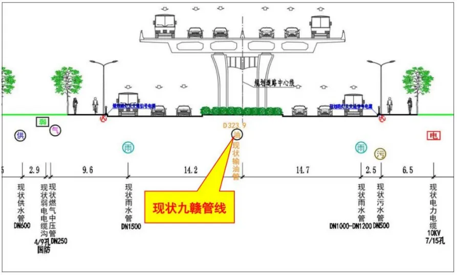 与此同时,由于拟建扩建英雄大道与现状九赣线位置直接与管道路由重叠,扩建英雄大道高架桥墩距离现状九赣线最近距离1.5m,无法满足《中华人民共和国石油天然气管道保护法》(主席令11届第30号)、《输油管道工程设计规范》(GB50253-2014)等国家相关法律规范要求,若不对现状管道进行迁改,规划道路实施将严重威胁管道的安全运行。