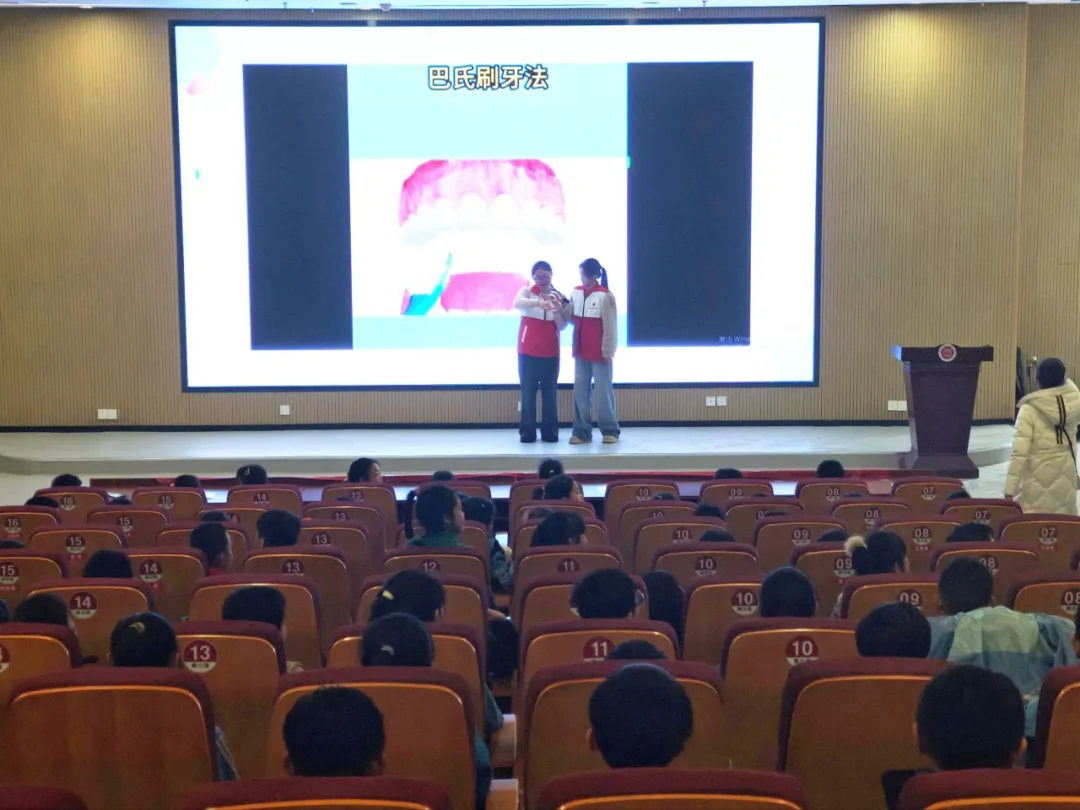 志愿者借助牙齿模型讲解牙齿结构、蛀牙成因及预防措施,并现场演示“巴氏刷牙法”,通过手把手指导帮助学生掌握正确护牙技巧。