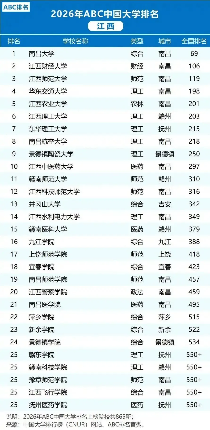 这就是江西高等教育的尴尬处境 , 整个省就一所211、一所双一流 , 放在全国来看 , 确实有点寒碜 , 不过寒碜归寒碜 , 省内高校之间的排位争夺还挺热闹的 , 2026年ABC中国大学排名刚更新 , 江西一共29所公办本科上榜 , 咱挑重点聊聊。