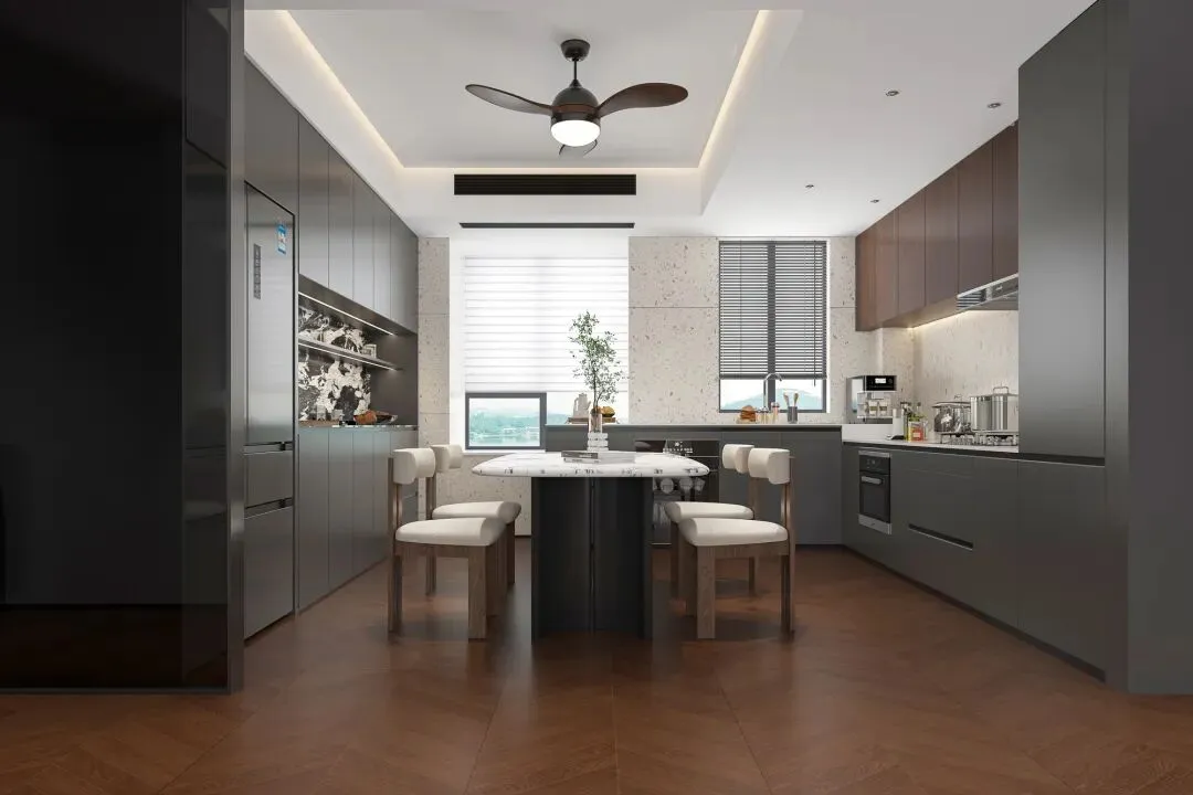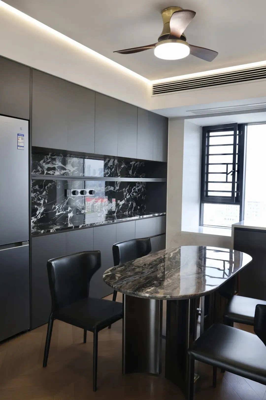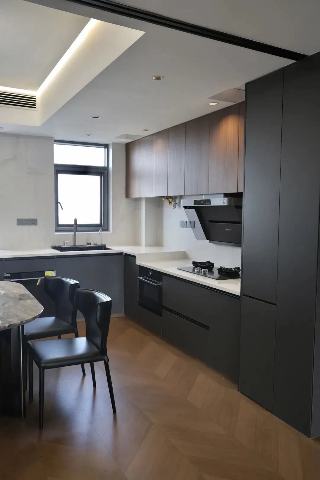 整面通顶的深灰哑光定制柜沿墙铺开,嵌入式冰箱与柜体完全齐平,实现了视觉上的隐形统一