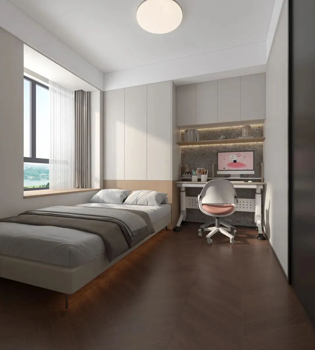 既和全屋风格高度统一,又精准贴合儿童房的使用需求,是一套能从幼儿用到青少年的“一步到位”设计。