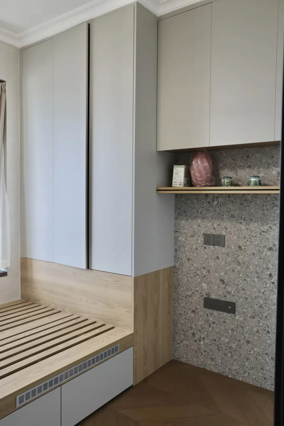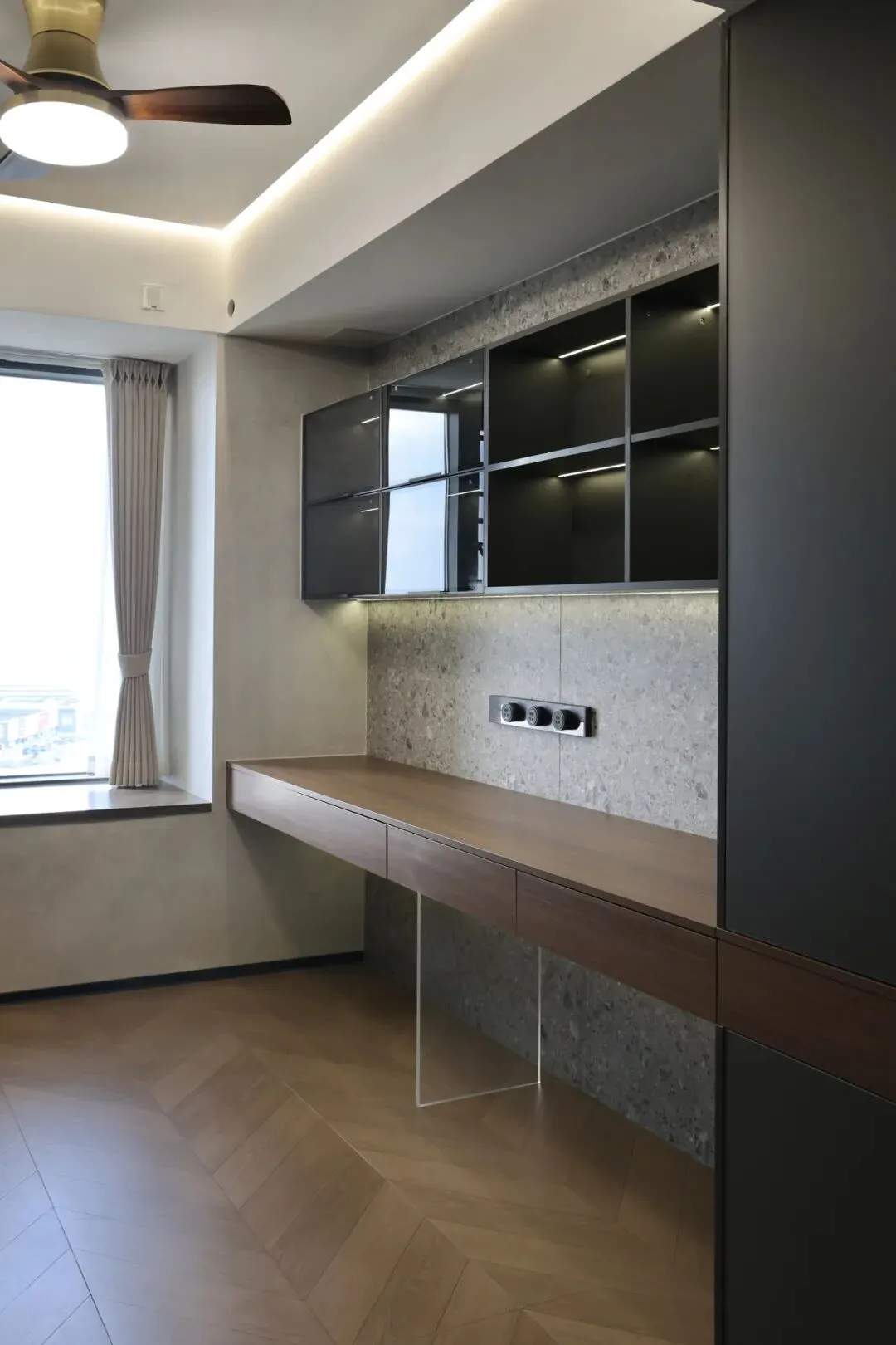 整个空间无冗余隔断,将「整墙收纳柜+悬浮办公区+飘窗休闲区」三大功能区无缝衔接。