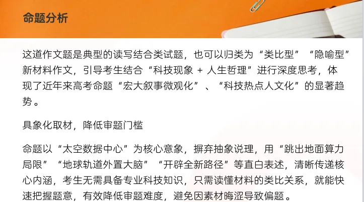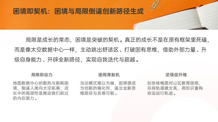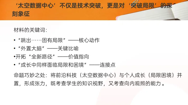 阅读|的材料一中,太空数据中心跳出地面算力的固有局限,成为地球轨道上人类的“外置大脑”,为发展开辟全新路径。这给成长中同样面临局限和困境的我们,带来了启示。