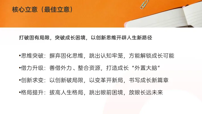 作为新时代青年,我们更应学会跳出局限,打造属于自己的“成长外置大脑”。学习中,我曾深陷题海战术的误区,成绩停滞不前,后来跳出盲目刷题的固化模式,整理错题、总结规律、借力师长同学,效率大幅提升。这让我深知,成长不是死磕到底,而是灵活变通;突破不是蛮干,而是找准新路径。面对局限,我们既要正视困境,更要拔高格局,以创新思维破局,以借力赋能升级,不被眼前的挫折定义,不被固有的模式束缚。