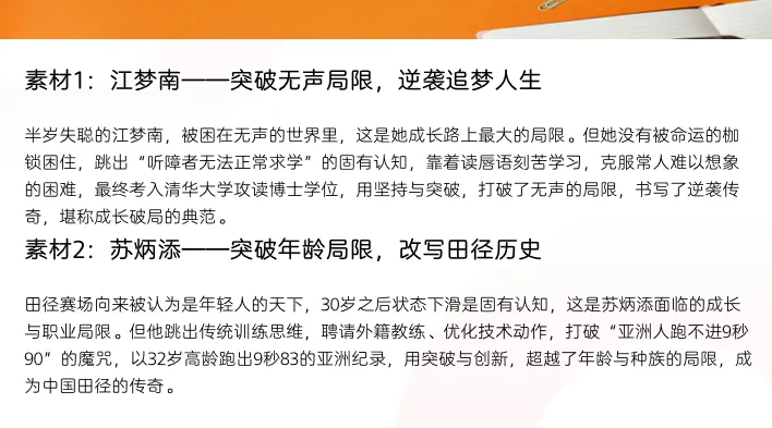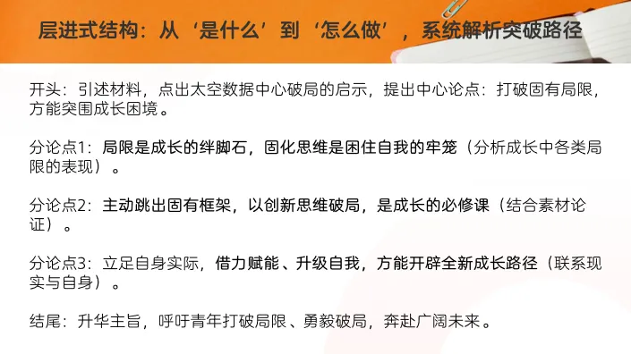 跳出局限、主动破局,是成长进阶的核心密码。太空数据中心以创新思路跳出地面局限,实现算力升级;成长中的我们,亦需以突破为刃,破开局限之茧。江梦南被困无声世界,却打破“听障者难成才”的固有偏见,以唇语为梯,攀登学术高峰,在清华园追逐梦想;苏炳添冲破年龄与种族的局限,摒弃传统训练思维,用科学方法突破极限,书写亚洲田径的传奇;俞敏洪跳出教培赛道的瓶颈,转型开辟直播新局,在困境中重生。他们无不是挣脱固有枷锁,以破局之勇,实现了自我超越。
