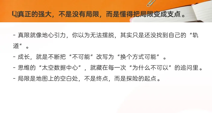局限是成长路上的必经关卡,固化思维则是困住自我的无形牢笼。成长之路从非一帆风顺,我们总会面临能力短板、认知偏差、环境束缚等种种局限:有人困在成绩的瓶颈里原地内耗,有人囿于世俗的眼光不敢追梦,有人守着陈旧的方法不愿改变。正如地面算力难以突破物理极限,若我们始终困在固有认知里,只会在原地打转,错失成长的契机。局限不可怕,可怕的是甘愿被局限束缚,失去破局的勇气与智慧。