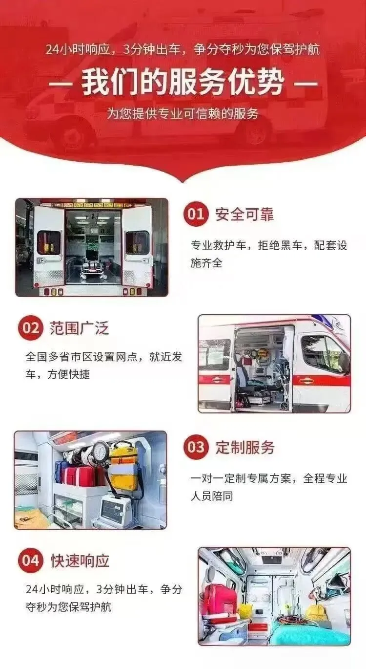 我们是救护车出租转运公司,120救护车接送病人预约护送。24小时为术后康复、危重患者及跨区域就医人群提供专业医疗转运服务,提供120救护车出租‖救护车转运‖私人120救护车(非急救)‖跨省长途转运‖危重病人转运‖市内转运‖术后康复病人转运‖高铁病人转运‖患者返乡‖大型活动赛事保障‖配备ICU设备:呼吸机▪心电监护仪▪吸痰器•微量泵•氧气▪急救药箱▪专业医护团队救护车出租转运电话:4009962227