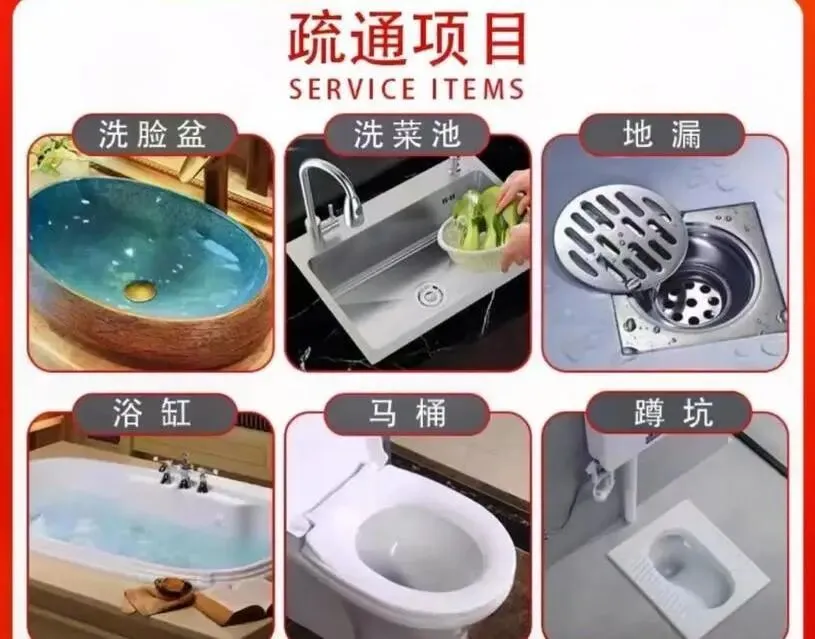 疏通类:家庭、酒店、饭店、店铺等各类下水管道疏通;马桶堵塞处理(支持拆卸、异物捞取及安装);面盆、菜池、蹲坑、地漏等全方位疏通与维修。