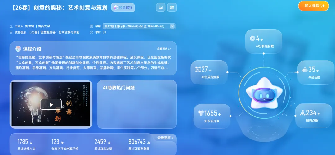 在教育数字化革新浪潮中,南昌大学《创意的奥秘:艺术创意与策划》智慧课程勇立潮头,以 AI 驱动的三维知识图谱重构教学逻辑,以虚实融合的创意实践平台对接产业需求,以跨学科知识体系赋能人才培养。课程依托国家级教学团队与省级精品在线资源,构建 "技术 + 创意 + 伦理" 三位一体培养模式,在传承文化基因中培育创新思维,在解决产业难题中锻造策划能力,真正实现 "创意育人、数智育才" 双突破。