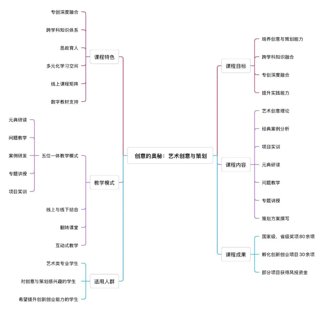 “创意的奥秘:艺术创意与策划”是一门以数字化与智能化为特色的专业教育课程,旨在培养具备数智化能力的复合型艺术创意人才。课程以省级一流课程为基础,深度融合信息技术与教学全流程,构建“智慧”课程体系。通过知识图谱架构分层关联的知识网络,整合全球顶尖艺术案例、前沿策划资源及虚拟现实(VR/AR)技术,打造沉浸式学习体验。课程采用线上线下混合授课模式(32学时),引入AI学伴、智能评估系统及产教融合虚拟实践平台,强化学生创意生成、策划执行与跨学科思维能力。