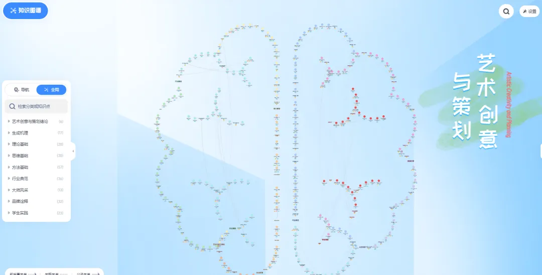 本课程以艺术创意核心流程为逻辑主线,构建分层分类的知识网络(顶层范畴→中层板块→底层知识点),通过 AI 技术实现知识点间因果、递进等关系的自动关联,形成可视化知识图谱。