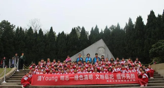 研支团志愿者和东湖小学学生在耀邦陵园扫墓合影