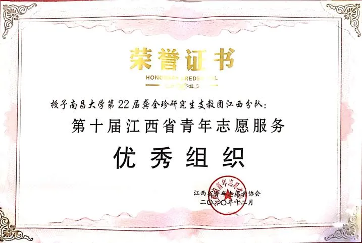 南昌大学研支团获第十届江西省青年志愿服务优秀组织奖