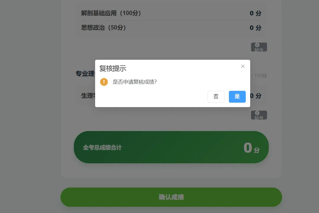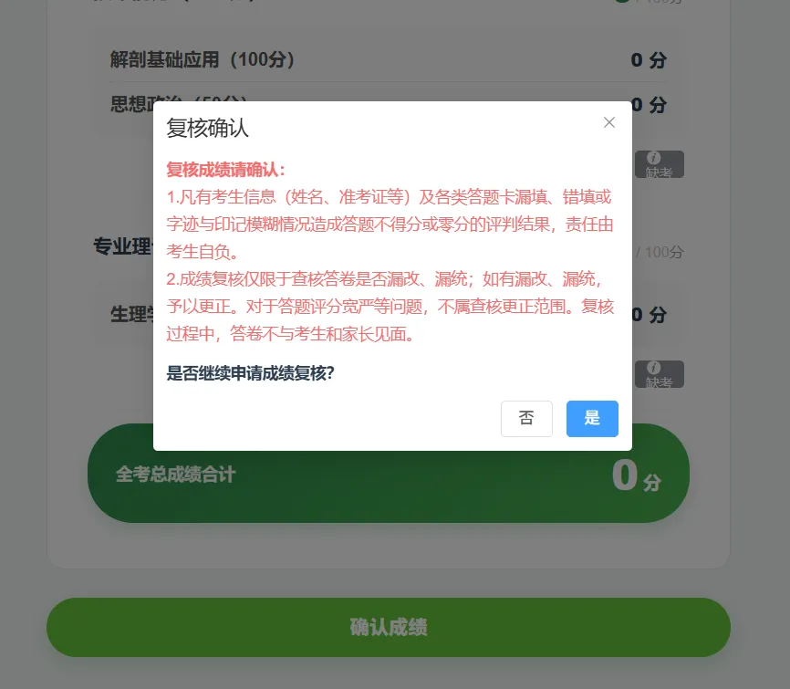 弹出“是否确认成绩”提示框,点“是”即结束确认;点“否”则再次弹出提示框“是否申请复核成绩”。