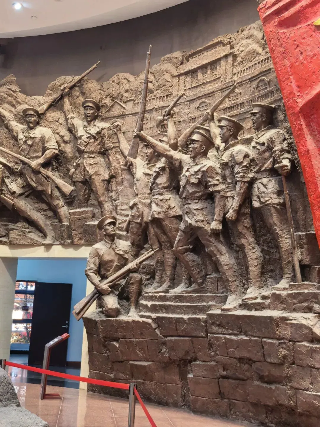 踏入馆区,首先映入眼帘的是一组气势恢宏的大型雕塑,栩栩如生地还原了1927年8月1日武装反抗国民党反动派、打响第一枪的震撼场景。