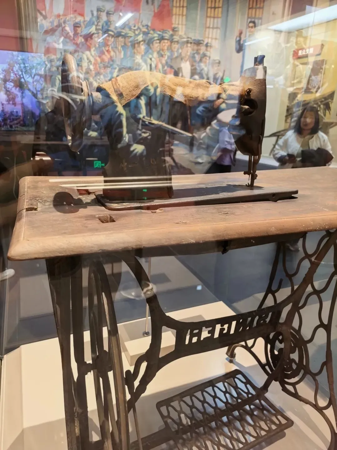特别值得一提的是展厅里的一台老式缝纫机,赭色机身,上面雕镂着“SINGER”字样,这是美国进口的胜家牌缝纫机,是当年南昌缝纫工人万国生使用过的。南昌起义胜利后,大批工人、学生和农民踊跃参军,部队人数骤增,军服一时供应不上。为了让新战士们能穿上军装,万国生和其他缝纫工人一起,日夜赶工,用这台脚踏缝纫机为起义军缝制军服。时间紧、任务重,他们顾不上休息,脚踩酸了、眼看花了,依旧坚持劳作,只为不耽误部队撤离的行程。如今这台缝纫机虽已锈迹斑斑,却见证了军民鱼水情深的动人过往,1958年,万国生将它捐赠给纪念馆,让这段历史得以留存。