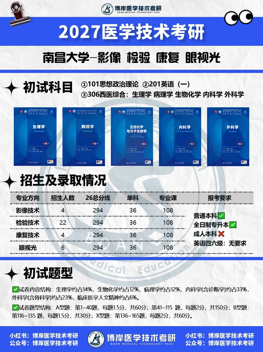 ✅招生录取(2026 参考):总分数线 294 分,单科线 36 分,专业课线 108 分;影像招 4 人、检验 22 人、康复 4 人、眼视光 6 人;报考门槛友好:接受普通本科 、全日制专升本,不接受成人本科,英语四六级无硬性要求。