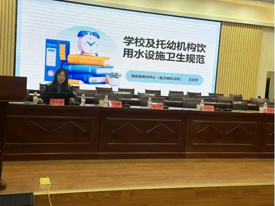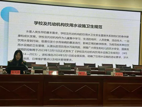 此次培训以全面强化学校卫生管理体系为核心目标,重点围绕《学校及托育机构饮用水设施卫生规范》进行了深入讲解。从卫生管理主体责任、设施日常清洁消毒规程、涉水产品索证管理、水质监测频率与记录规范等维度展开系统解读。
