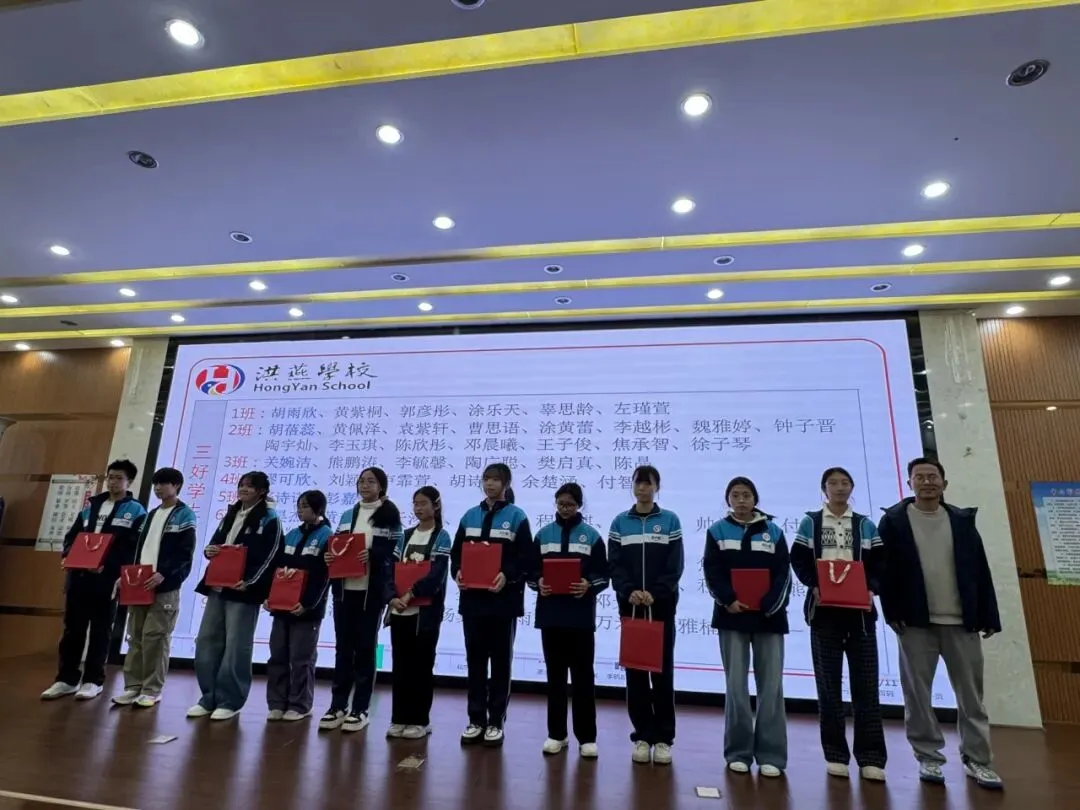 主持人宣读表彰决定,正式揭晓本次表彰的全部名单,奖项覆盖班主任、教师、学生三大类别,全方位表彰表现突出的集体与个人,彰显学校对教育初心的坚守与对师生成长的重视。具体表彰名单如下:领航班主任2名、优秀班主任3名;优秀教师3名、教学能手6名、师德标兵6名;三好学生72名、优秀班干部35名、学习标兵26名、文明学生54名、进步之星38名。每一份荣誉都是师生们用汗水与坚持换来的成果,每一个名字都承载着努力与成长。