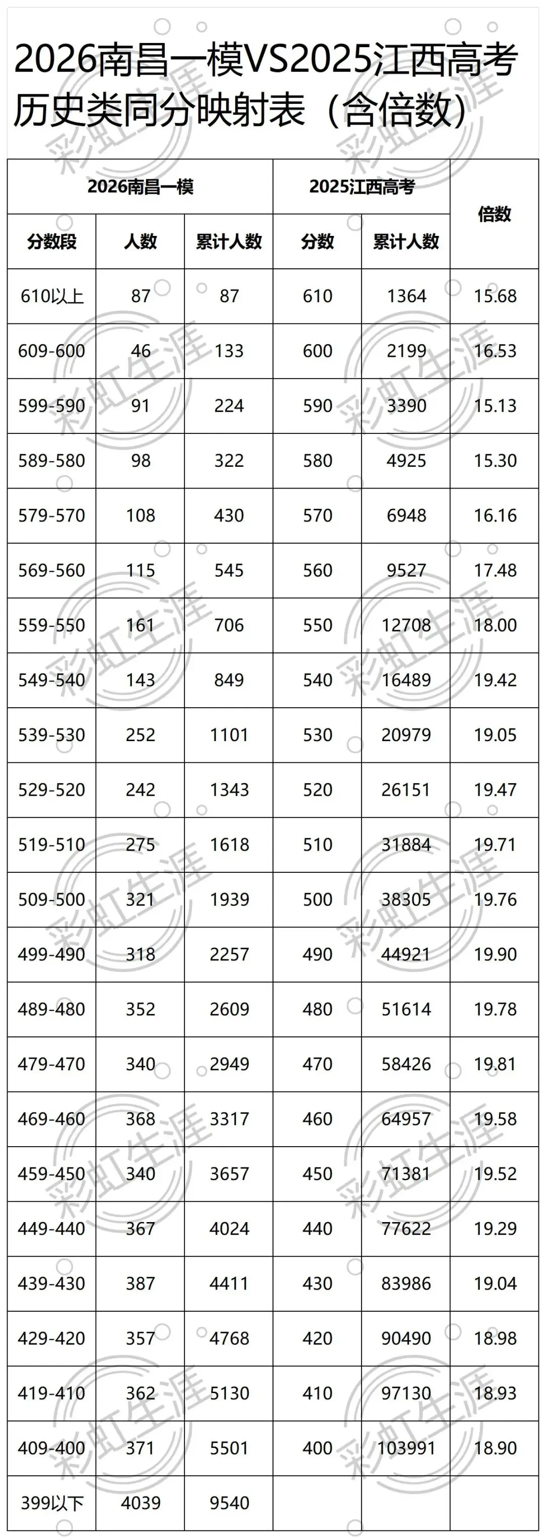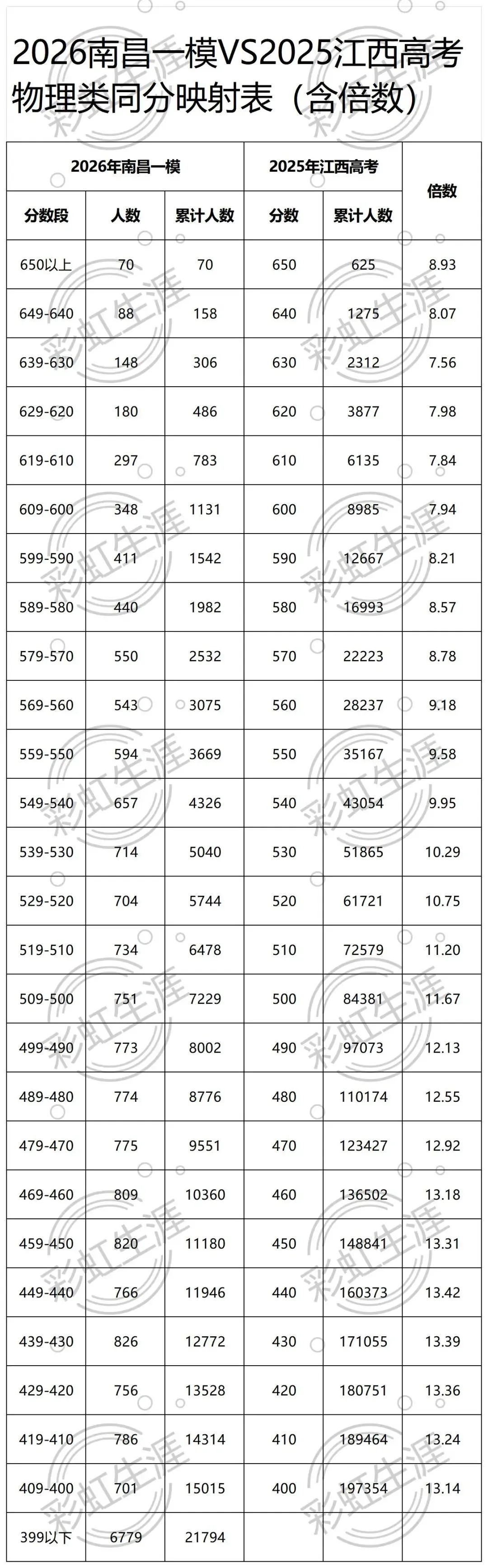 2026南昌一模VS2025江西高考同分映射表(含倍数)