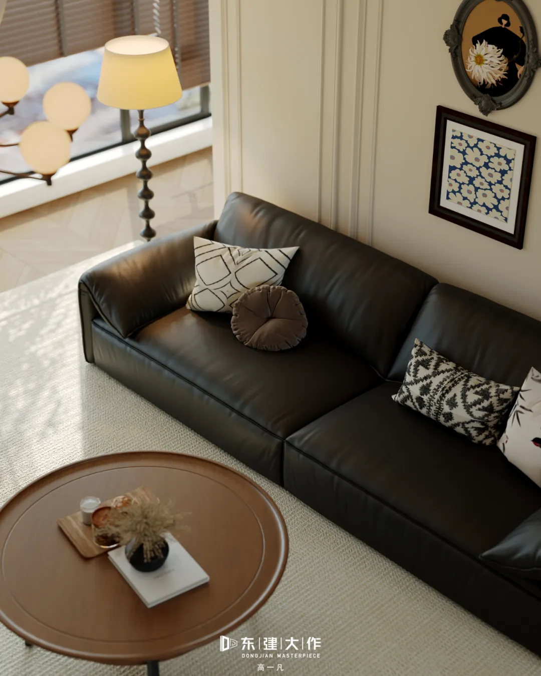 - 材质碰撞:胡桃木的温润、皮质的厚重与奶油白的柔和,交织出复古又治愈的氛围。