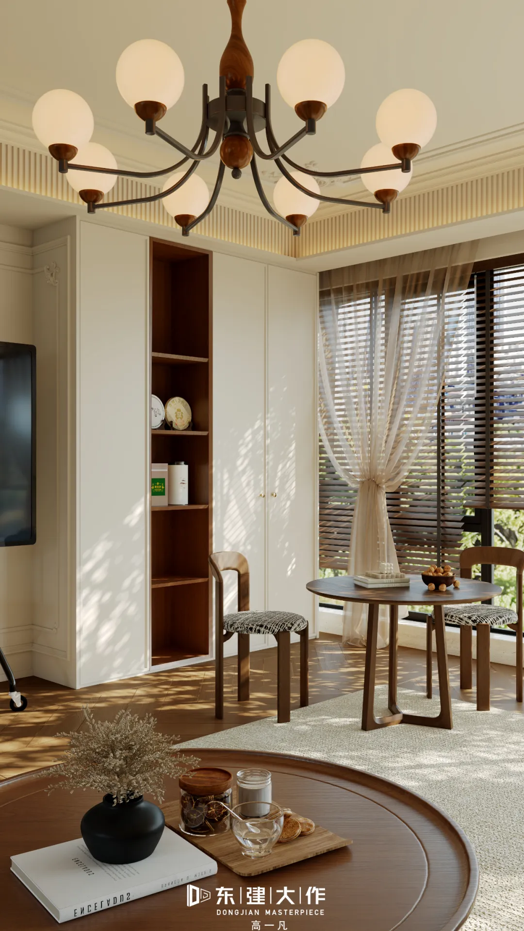 - 灯光层次:主吊灯+落地灯+壁灯,满足会客、阅读、观影等不同场景的光线需求。