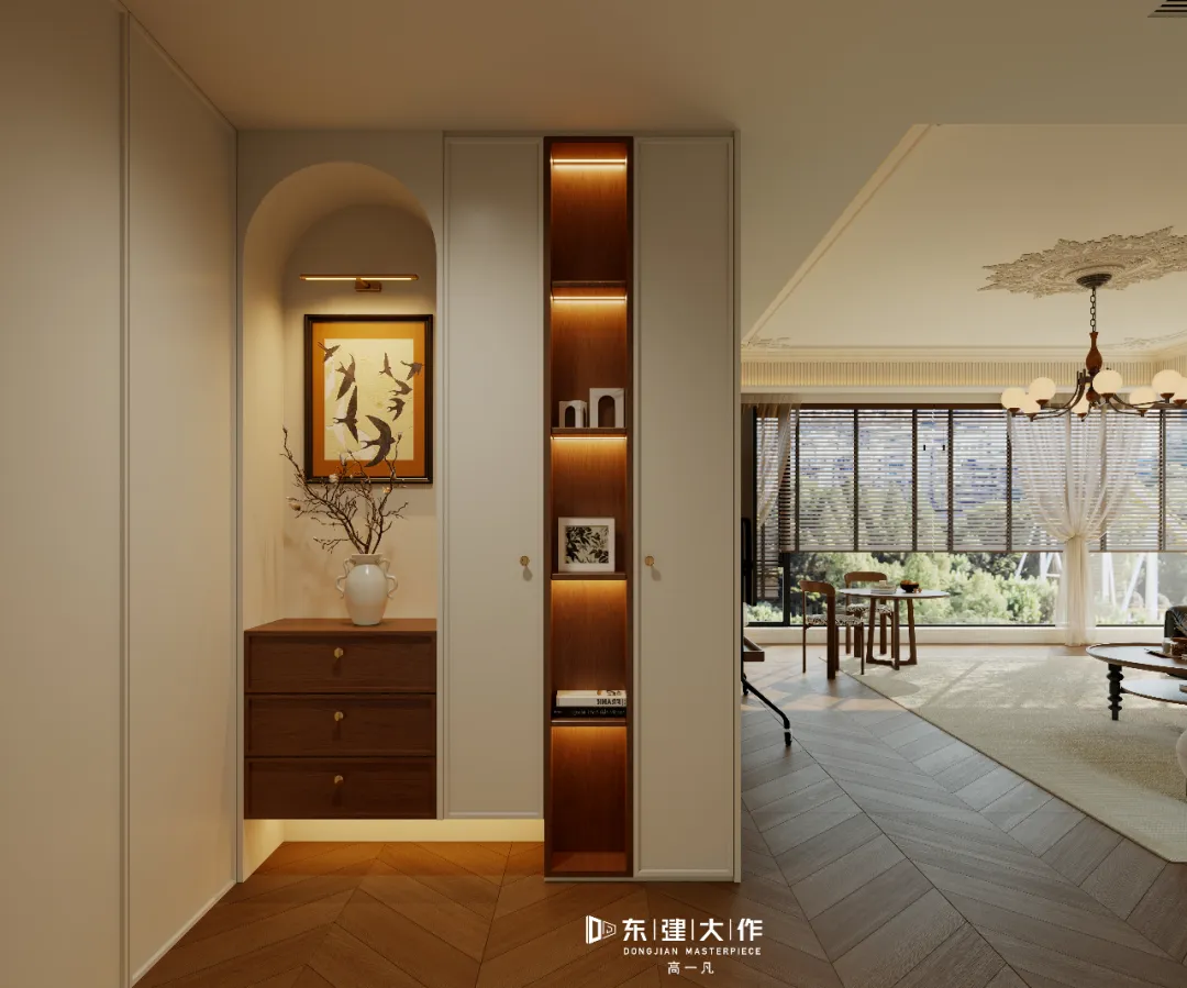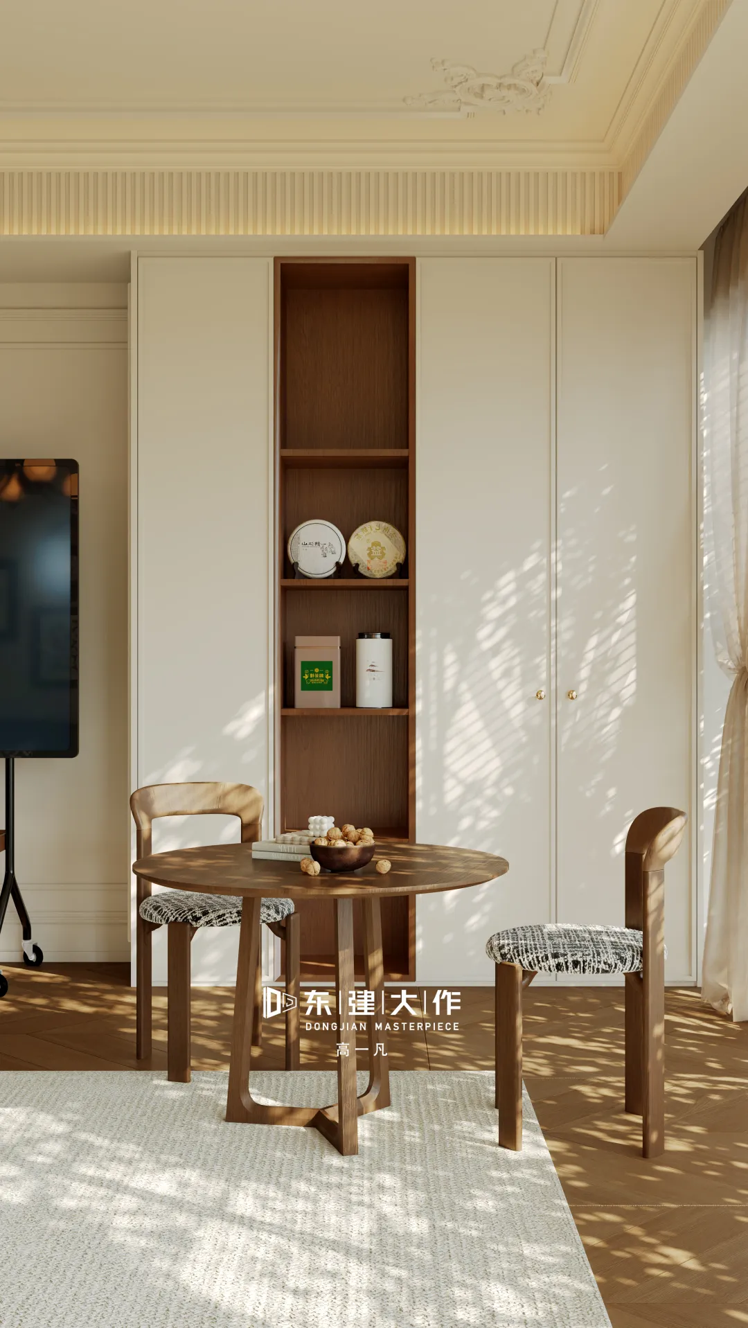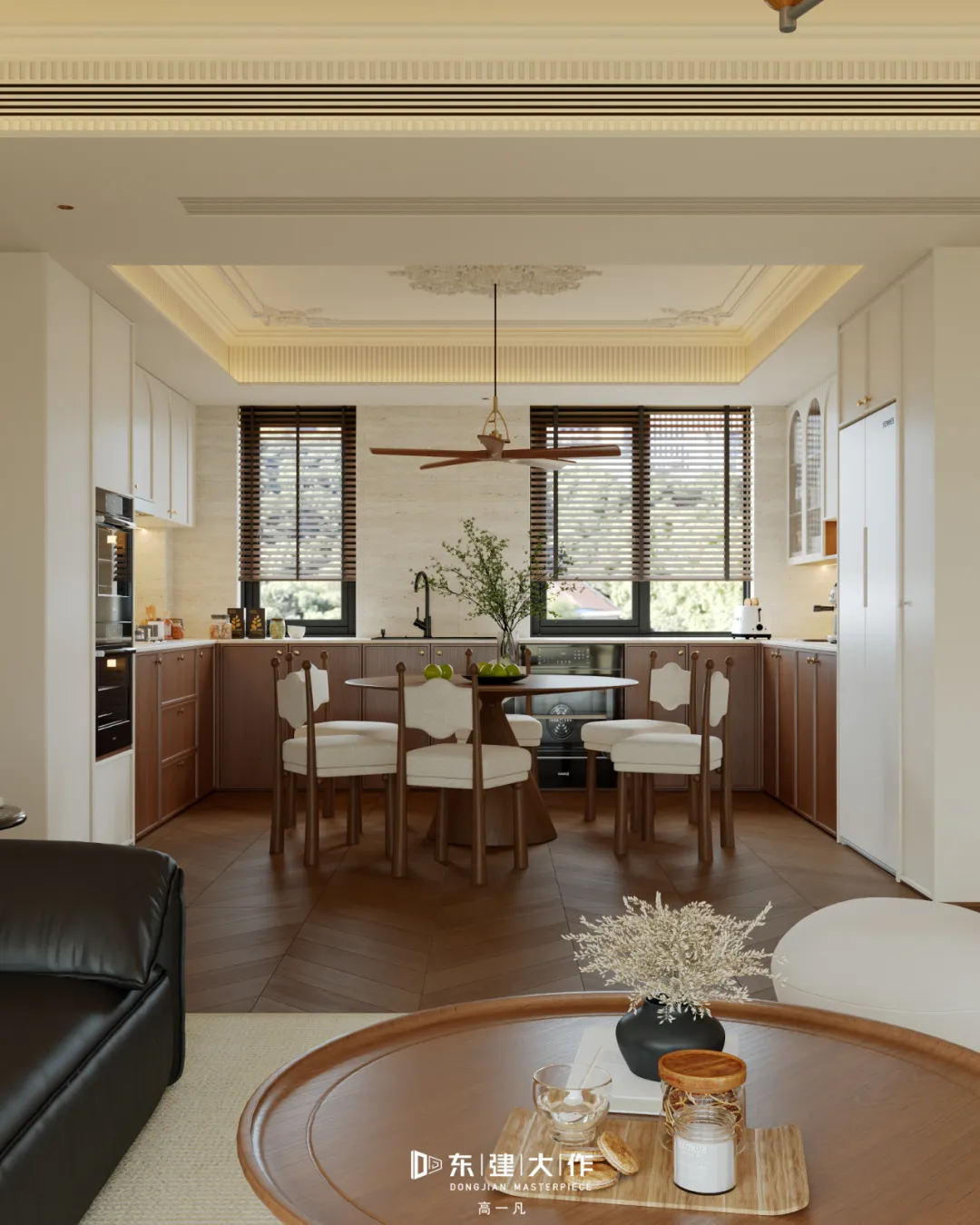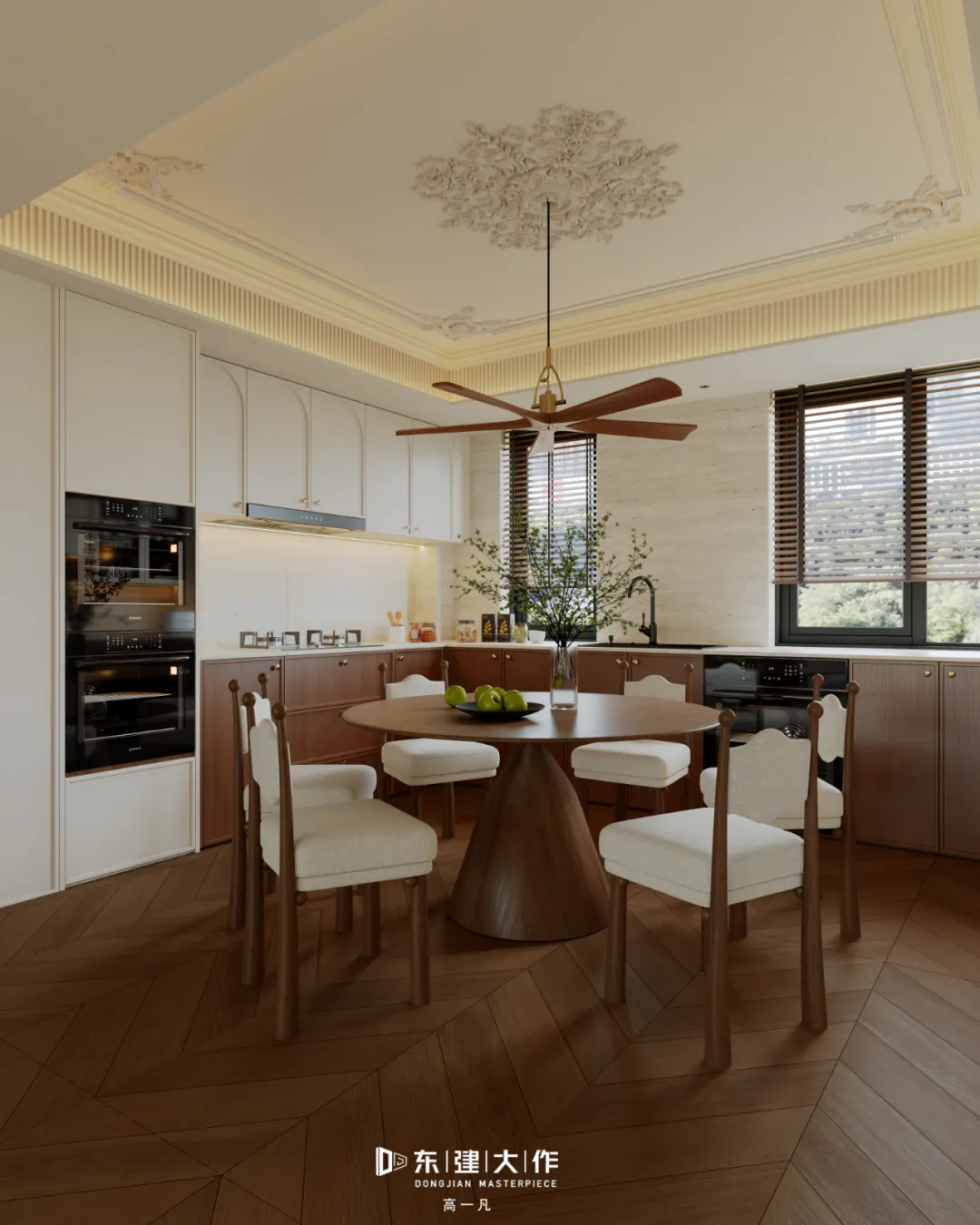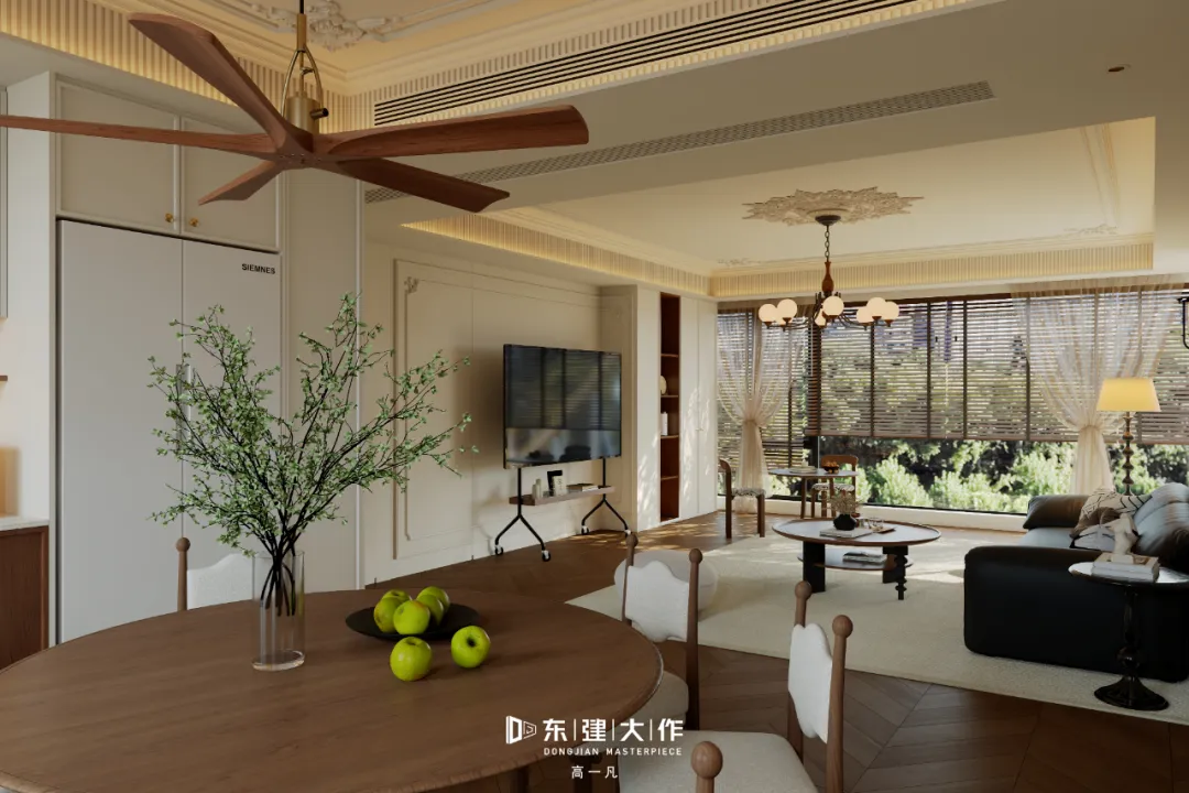 胡桃木的温润肌理与奶白柜体温柔相拥,人字拼地板延伸着岁月的温度,雕花吊顶与复古吊扇晕出轻复古的浪漫。阳光透过百叶窗筛落细碎光斑,绿植与青苹果点缀着烟火日常,在餐厨与客厅的通透联动里,每一处光影与线条都在诉说着松弛又有质感的生活,让归家的每一步都踏在温柔里。