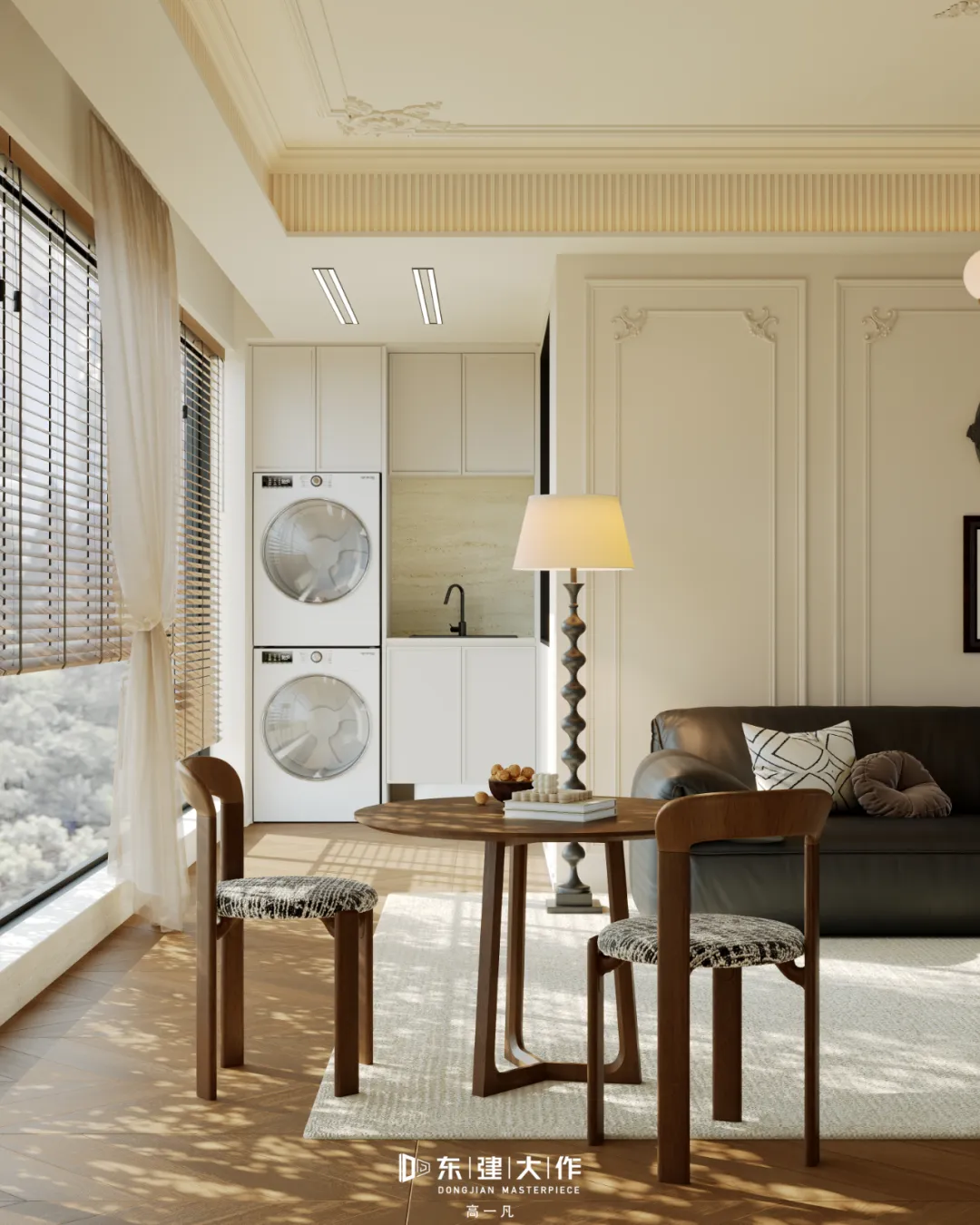 洗烘一体的家政区藏于简洁柜体后,让生活琐碎有序归置;开放格与封闭柜的组合,既收纳了日常,也陈列着对生活的热爱。