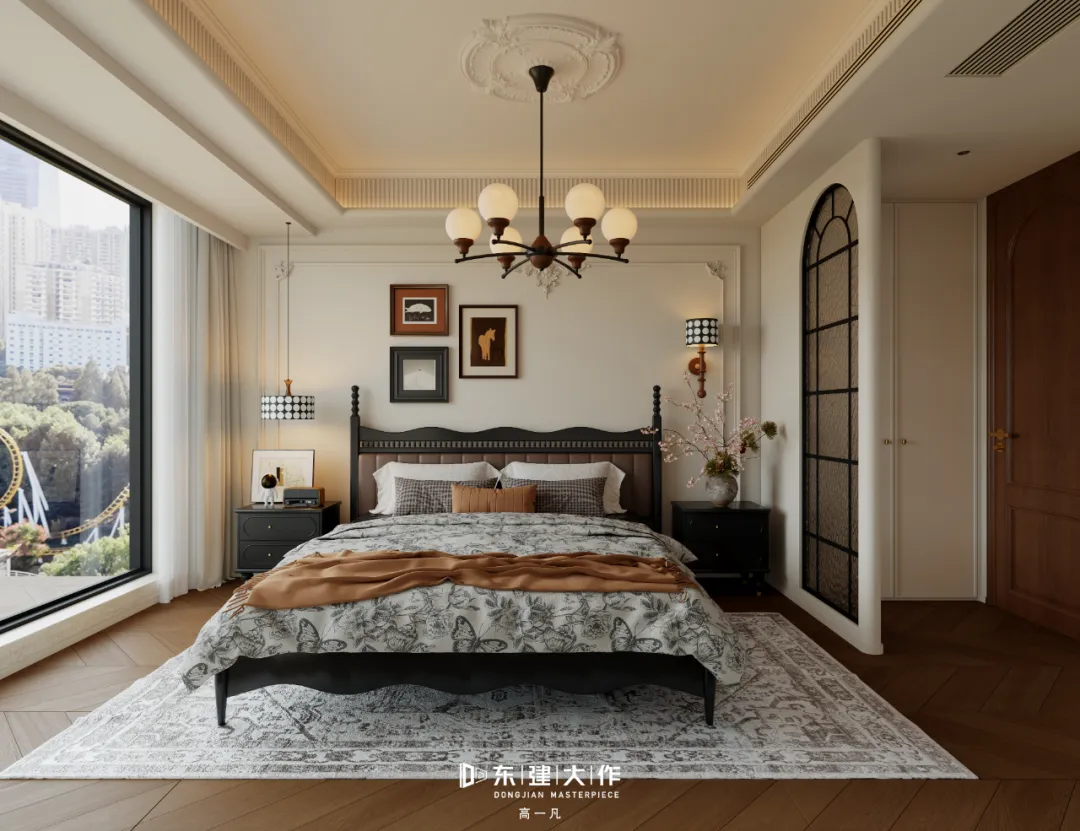 复古黑胡桃木床架撑起温柔梦境,蝴蝶印花床品与焦糖色毯子晕出慵懒氛围,雕花吊顶与复古吊灯诉说着轻法式的浪漫。格纹玻璃门与黑白格壁灯点缀细节,大窗将城市绿意框成画,在暖光与木质纹理的包裹里,每一晚都能枕着松弛与诗意入眠。