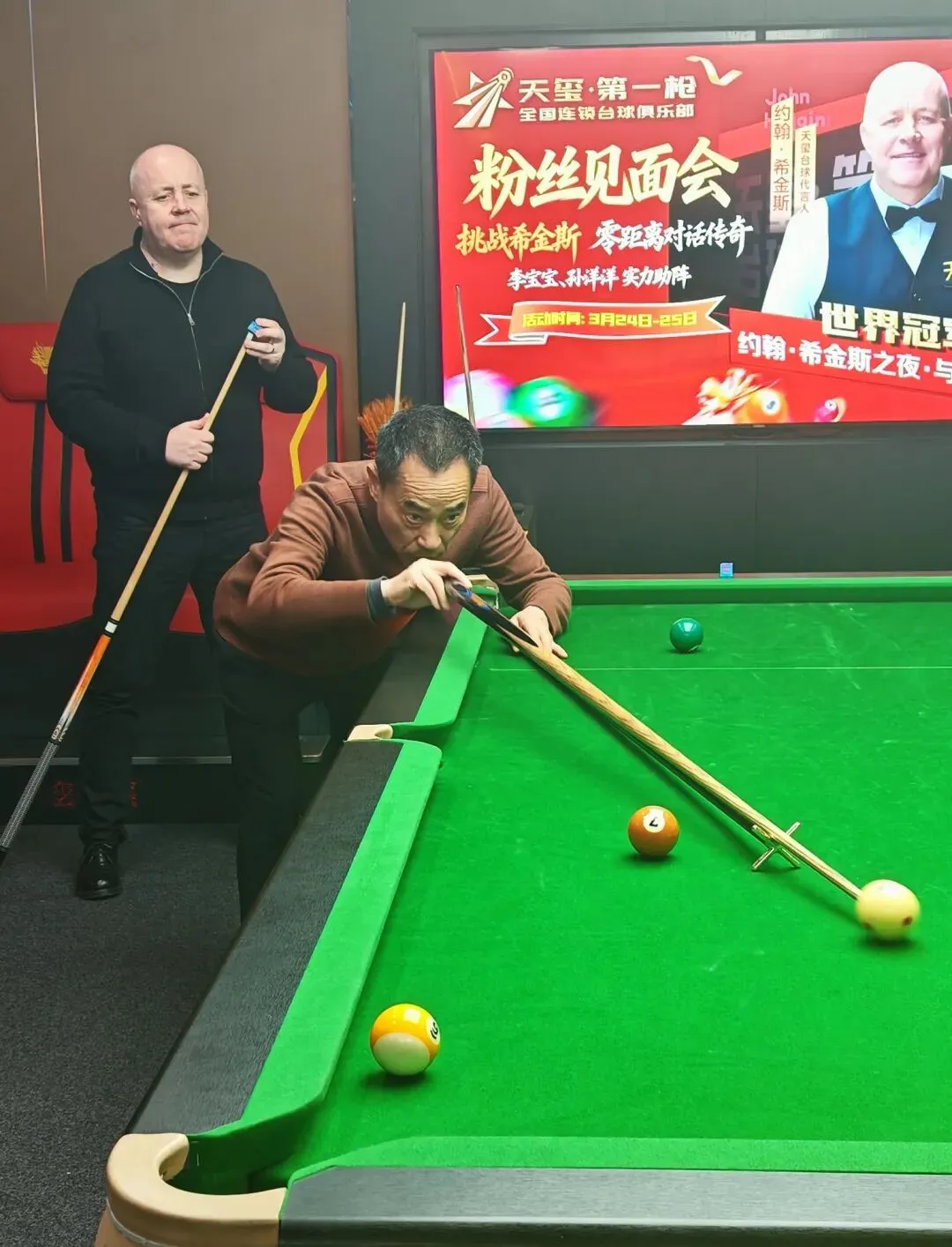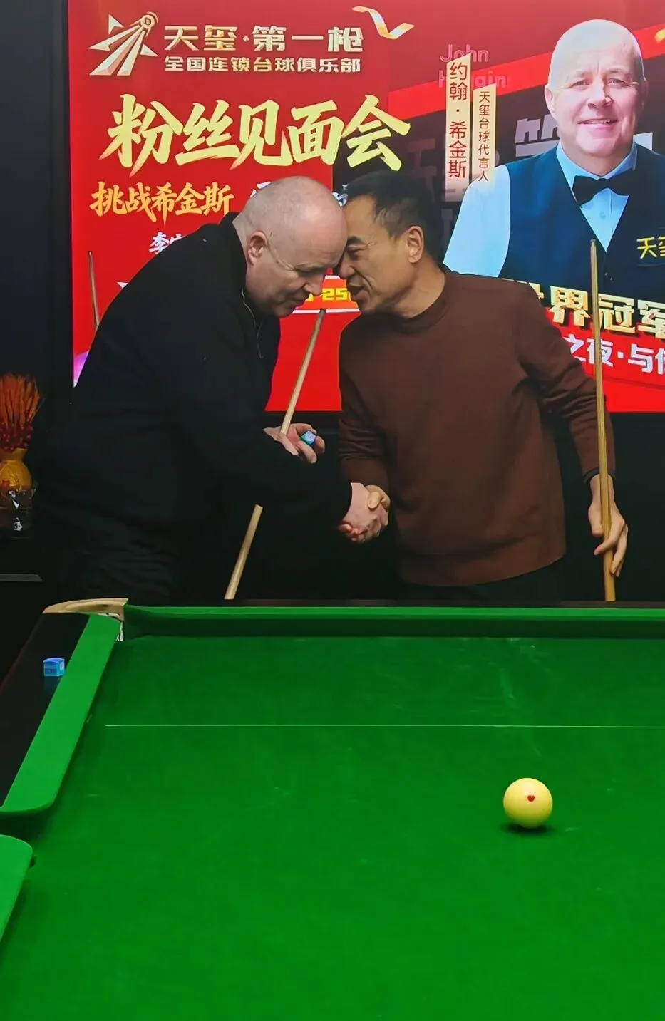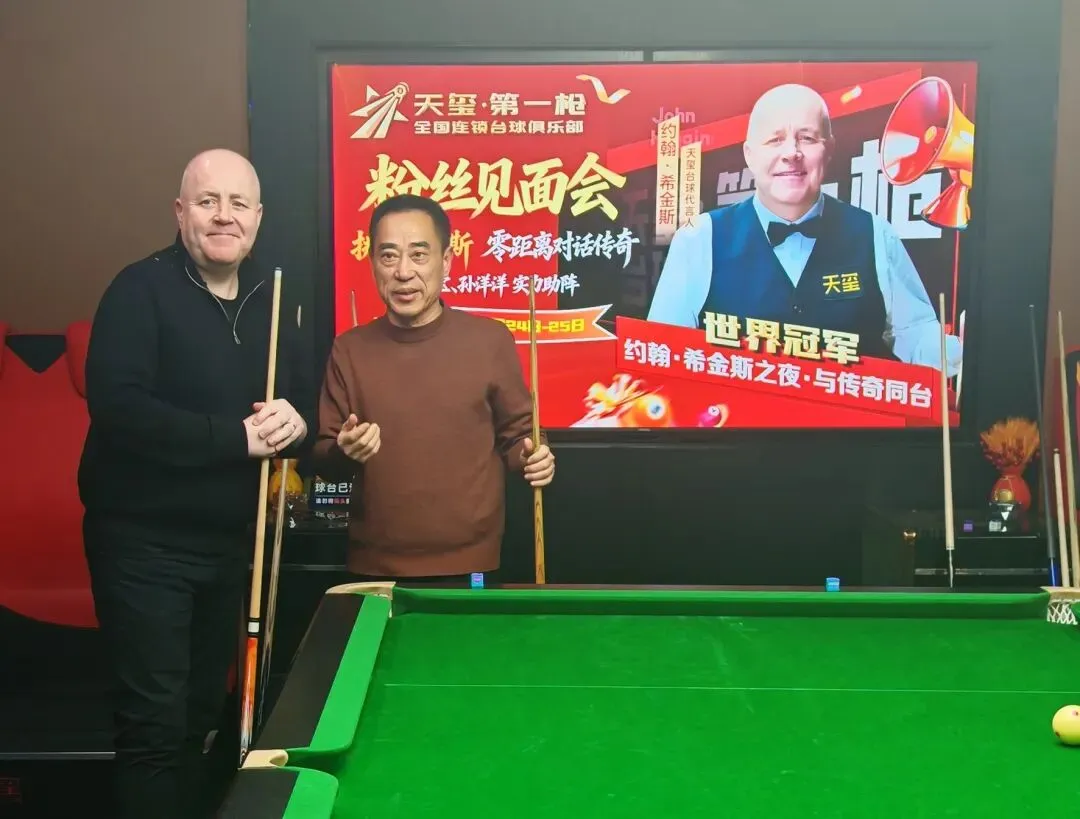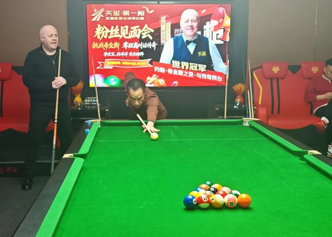 我的好友黄平先生,是南昌老年斯诺克爱好者中的一员。他退休后才与台球结缘,仅仅两年多的时间,便如痴如醉地沉浸其中。斯诺克频道成了他日常生活的忠实伴侣,手机抖音里满满当当都是赛事视频,台球已然融入了他生活的每一个角落,成为他生命中不可或缺的一部分。希金斯的传奇故事如同一股强大的磁力,深深吸引着他,在他的心中种下了一颗向往的种子——与偶像同台、与世界冠军对话,成了他魂牵梦绕的执念。